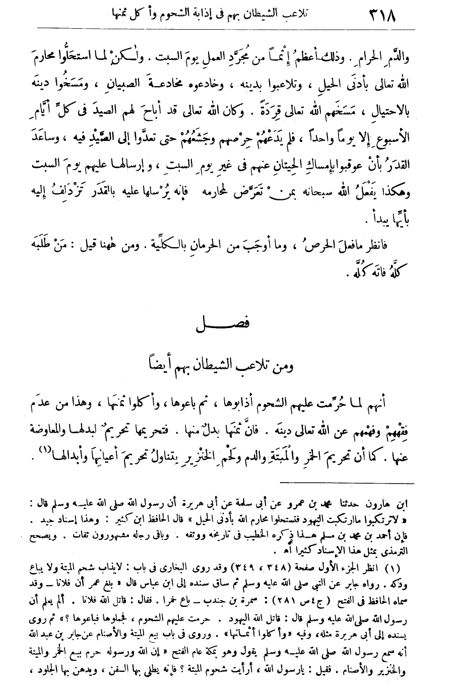ومن تلاعب الشيطان بهم أيضا: أنهم لما حرمت عليهم الشحوم أذابوها، ثم باعوها، وأكلوا أثمانها، وهذا من عدم فقههم وفهمهم عن الله تعالى دينه. فإن ثمنها بدل منها. فتحريمها تحريم لبدلها والمعاوضة عنها. كما أن تحريم الخمر والميتة والدم ولحم الخترير يتناول تحريم أعيانها وأبدالها.