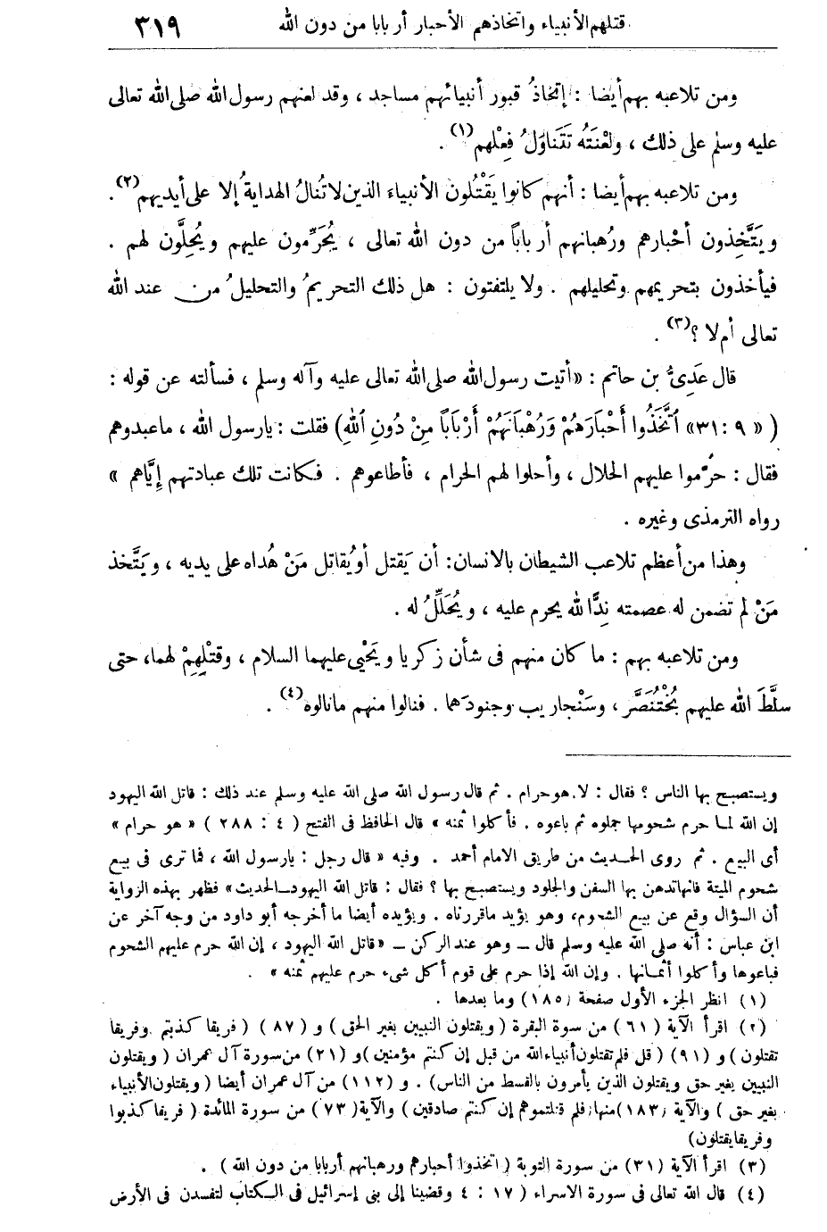 قال عدى بن حاتم: "أتيت رسول الله صلى الله تعالى عليه وآله وسلم، فسألته عن قوله. {اتّخَذُوا أَحْبَارَهُمْ وَرُهْبَانَهُمْ أَرْبَاباً مِنْ دُونِ اللهِ} [التوبة: 31] . فقلت: يا رسول الله، ما عبدوهم، فقال: حرموا عليهم الحلال، وأحلوا لهم الحرام، فأطاعوهم. فكانت تلك عبادتهم إياهم" رواه الترمذى وغيره.