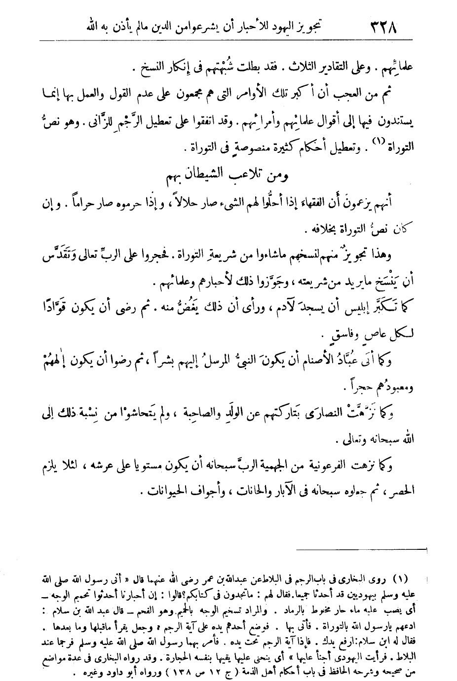 ثم من العجب أن أكبر تلك الأوامر التى هم مجمعون على عدم القول والعمل بها إنما يستندون فيها إلى أقوال علمائهم وأمرائهم. وقد اتفقوا على تعطيل الرجم للزانى، وهو نص التوراة. وتعطيل أحكام كثيرة منصوصة فى التوراة.