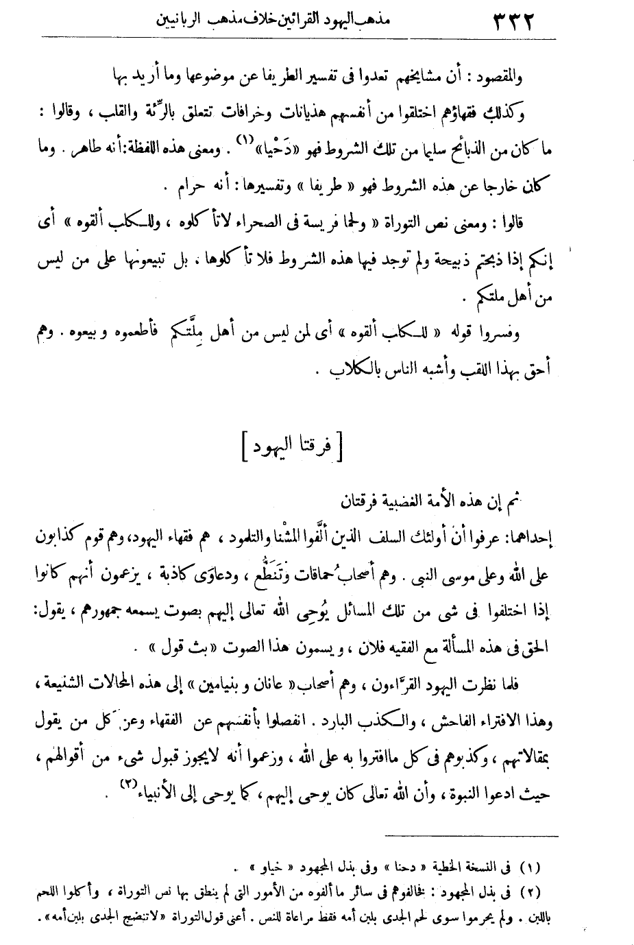 إحداهما: عرفوا أن أولئك السلف الذين ألفوا المشنا والتلمود، هم فقهاء اليهود، وهم قوم كذابون على الله وعلى موسى النبى. وهم أصحاب حماقات وتنطع، ودعاوى كاذبة، يزعمون أنهم كانوا إذا اختلفوا فى شيء من تلك المسائل يوحى الله تعالى إليهم بصوت يسمعه جمهورهم، يقول: الحق فى هذه المسألة مع الفقيه فلان، ويسمون هذا الصوت "بث قول".
