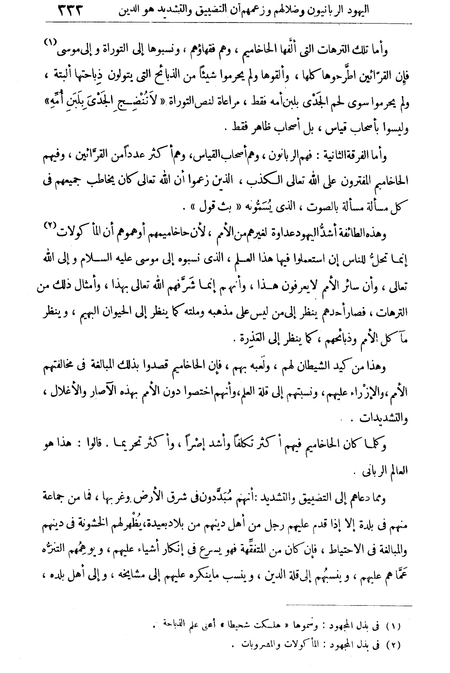 وأما الفرقة الثانية: فهم الربانون، وهم أصحاب القياس، وهم أكثر عددا من القرائين، وفيهم الحاخاميم المفترون على الله تعالى الكذب، الذين زعموا أن الله تعالى كان يخاطب جميعهم فى كل مسألة بالصوت، الذى يسمونه "بث قول".
