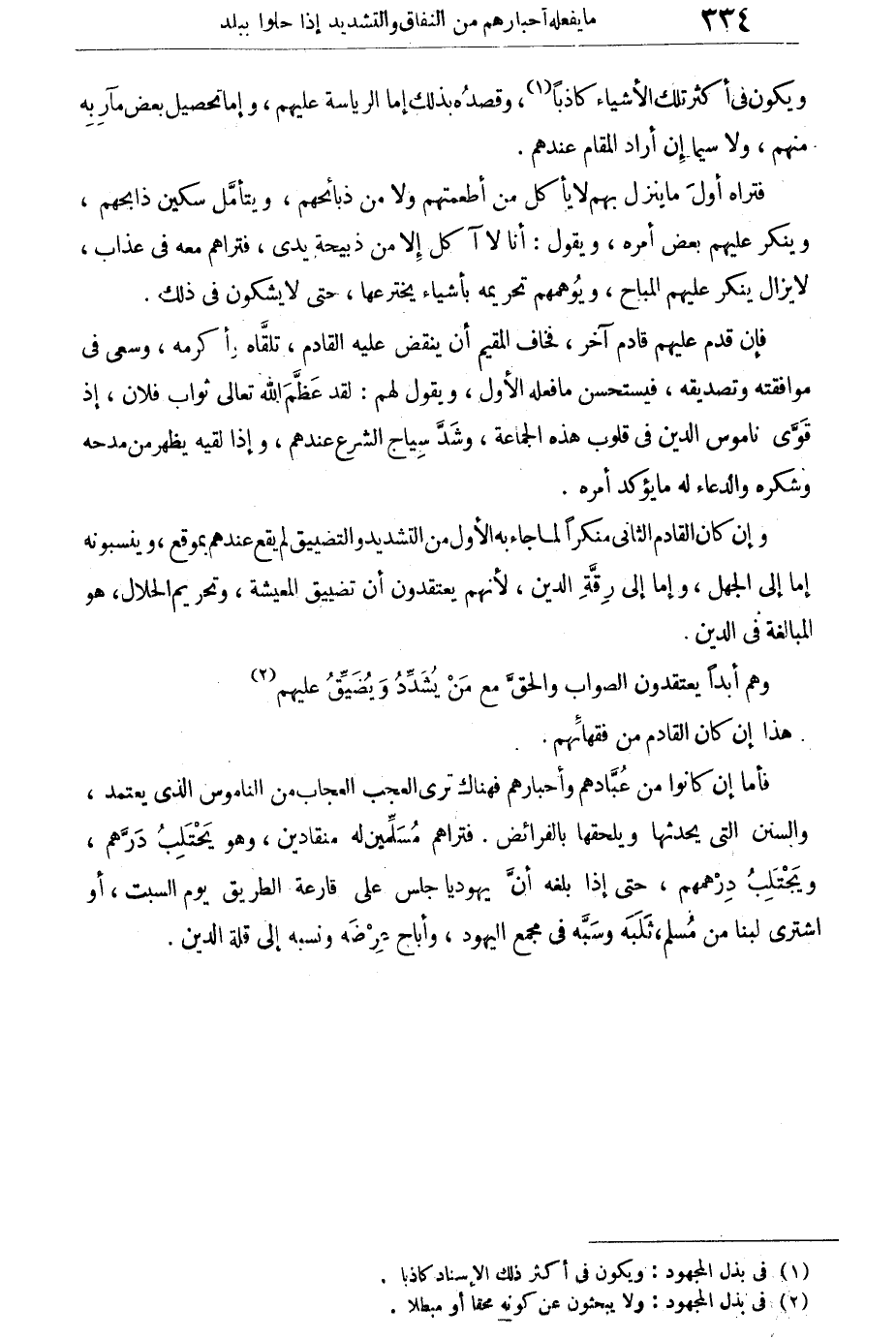 فأما إن كانوا من عبادهم وأحبارهم فهناك ترى العجب العجاب من الناموس الذى يعتمد، والسنن التى يحدثها ويلحقها بالفرائض. فتراهم مسلمين له منقادين، وهو يحتلب درهم، ويجتلب درهمهم، حتى إذا بلغه أن يهوديا جلس على قارعة الطريق يوم السبت، أو اشترى لبنا من مسلم، تلبسه وسبه فى مجمع اليهود، وأباح عرضه ونسبه إلى قلة الدين.