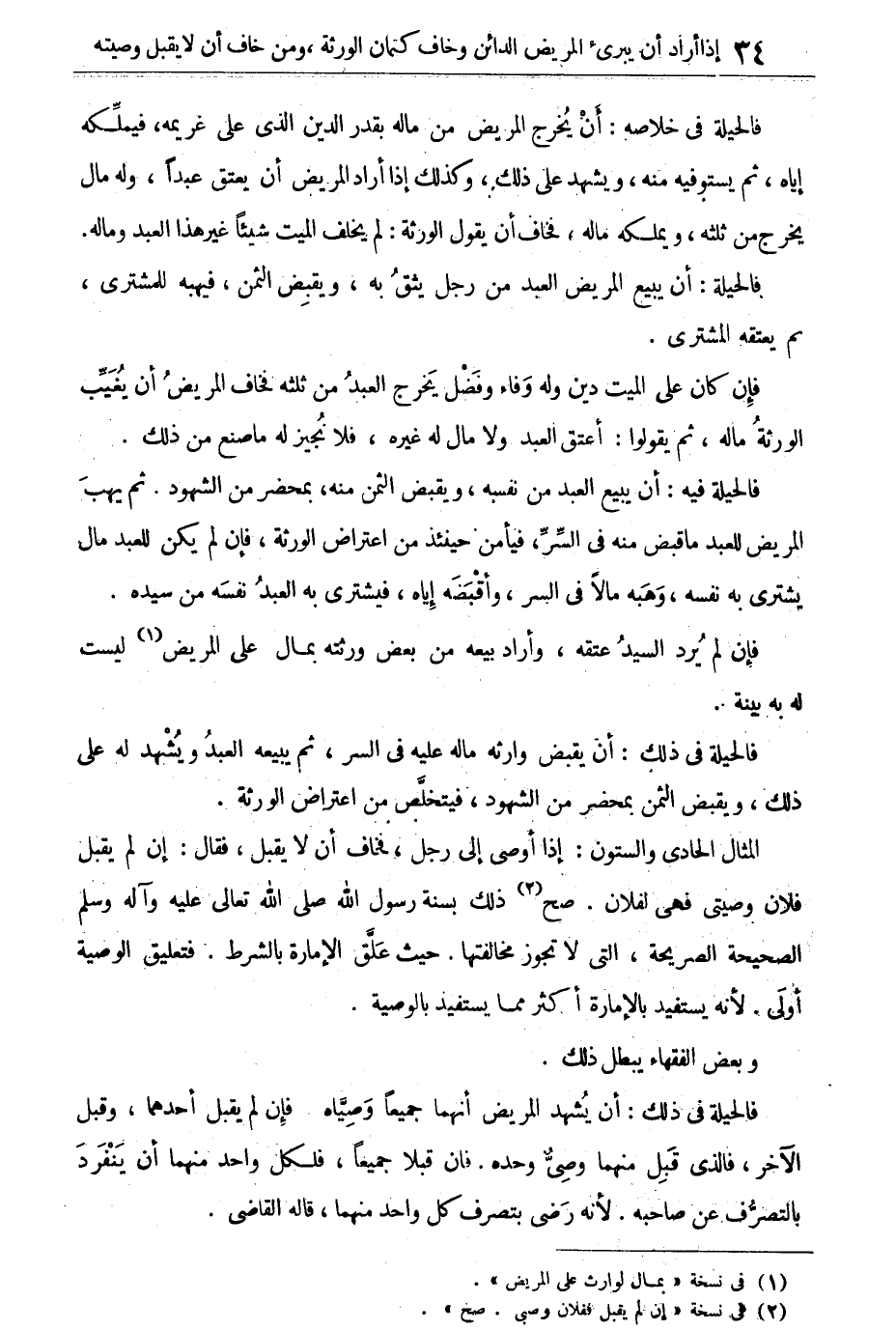 فالحلية فى خلاصه: أن يخرج المريض من ماله بقدر الدين الذى على غريمه، فيملكه إياه، ثم يستوفيه منه، ويشهد على ذلك، وكذلك إذا أراد المريض أن يعتق عبداً، وله مال يخرج من ثلثه، ويملكه ماله، فخاف أن يقول الورثة: لم يخلف الميت شيئاً غير هذا العبد وماله.