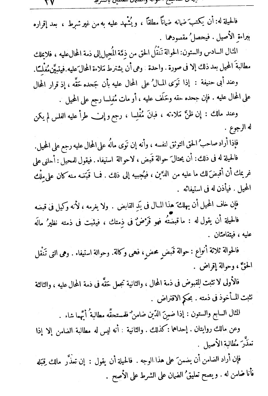 المثال السادس والستون: الحوالة تنقل الحق من ذمة المحيل إلى ذمة المحال عليه، فلا يملك مطالبة المحيل بعد ذلك إلا فى صورة واحدة، وهى: أن يشترط ملاءة المحال عليه فيتبين مفلساً.