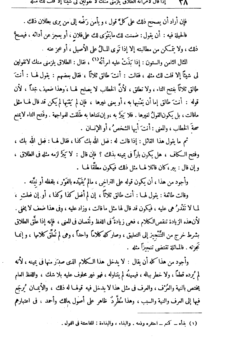 المثال الثامن والستون: إذا بذت عليه امرأته، فقال: الطلاق يلزمنى منك لا تقولين لى شيئاً إلا قلت لك مثله، فقالت: أنت طالق ثلاثاً، فقال بعضهم: يقول لها: أنت طالق ثلاثاً بفتح التاء، ولا تطلق، لأن الخطاب لا يصلح لها، وهذا ضعيف جداً، لأن قوله: أنت طالق إما أن يعنيها به، أو يعنى غيرها، فإن لم يعنها لم يكن قد قال لها مثل ما قالت بل يكون القول لغيرها فلا يبر به وإن عناها به طلقت للمواجهة وفتح لتاء لا يمنع صحة الخطاب، والمعنى: أنت أيها الشخص، أو الإنسان.