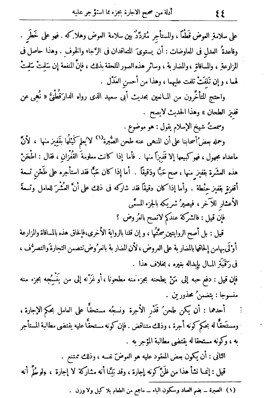 وحمله بعض أصحابنا على أن المنهى عنه طحن الصبرة لا يعلم كيلها بقفيز منها، لأن ماعداه مجهول، فهو كبيعها إلا قفيزا منها، فأما إذا كانت معلومة القفزان، فقال: اطحن هذه العشرة بقفيز منها، صح حبا ودقيقاً. أما إذا كان حبا فقد استأجره على طحن تسعة أقفزة بقفيز حنطة. وأما إذا كان دقيقاً شاركه فى ذلك على أن العشر للعامل وتسعة الأعشار للآخر، فيصير شريكه بالجزء المسمى.