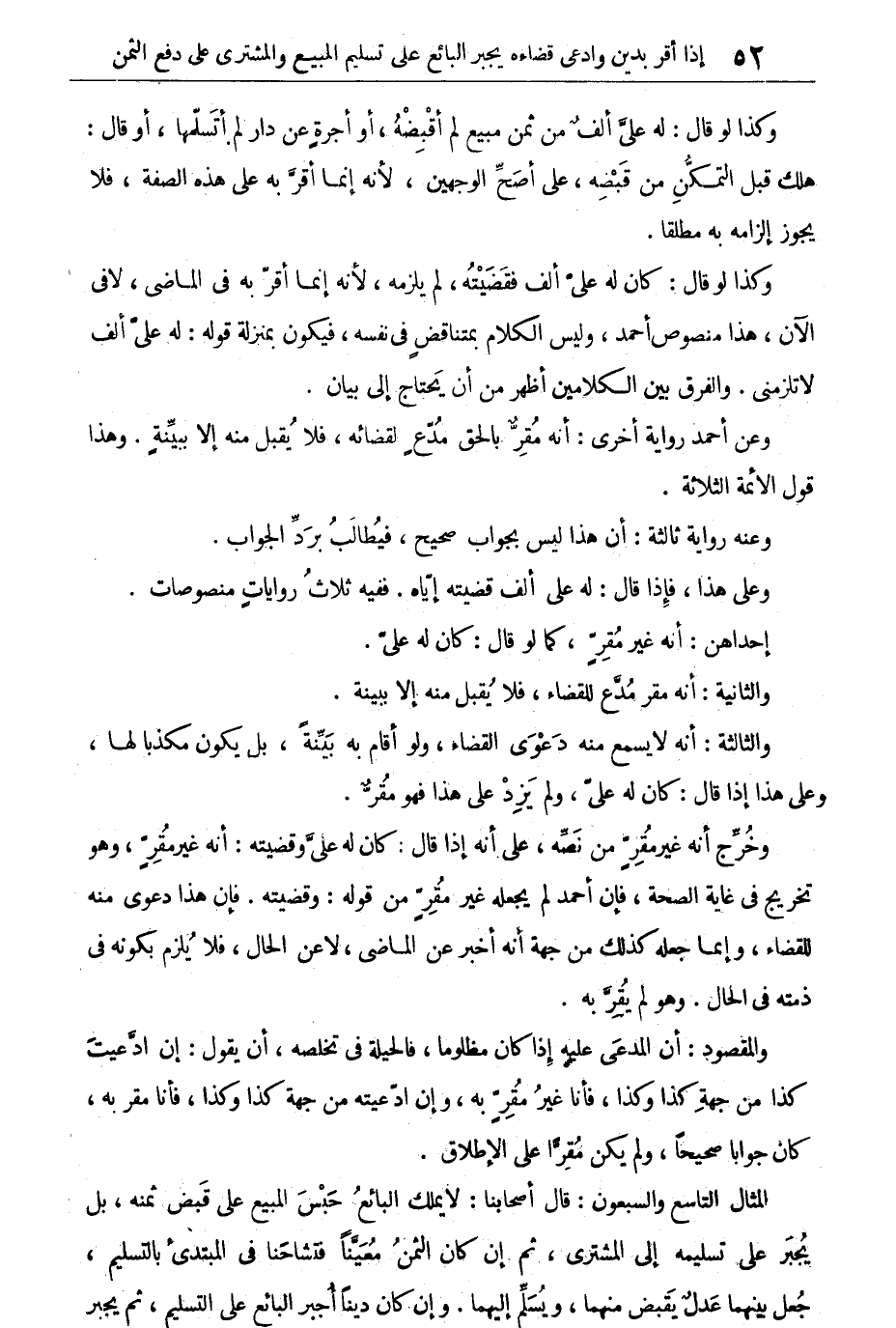 المثال التاسع والسبعون: قال أصحابنا: لا يملك البائع حبس المبيع على قبض ثمنه، بل يجبر على تسليمه إلى المشترى، ثم إن كان الثمن معينا فتشاحنا فى المبتدئ بالتسليم، جعل بينهما عدل يقبض منهما، ويسلم إليهما. وإن كان ديناً أجبر البائع على التسليم، ثم يجبر