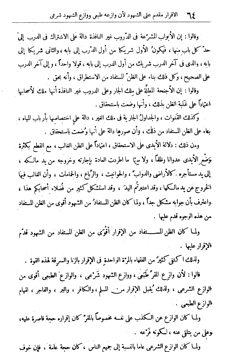 ولما كان الظن المستفاد من الإقرار أقوى من الظن المستفاد من الشهود قدم الإقرار عليها. ولذلك اكتفى كثير من الفقهاء بالمرة الواحدة فى الإقرار بالزنا والسرقة لهذه القوة.