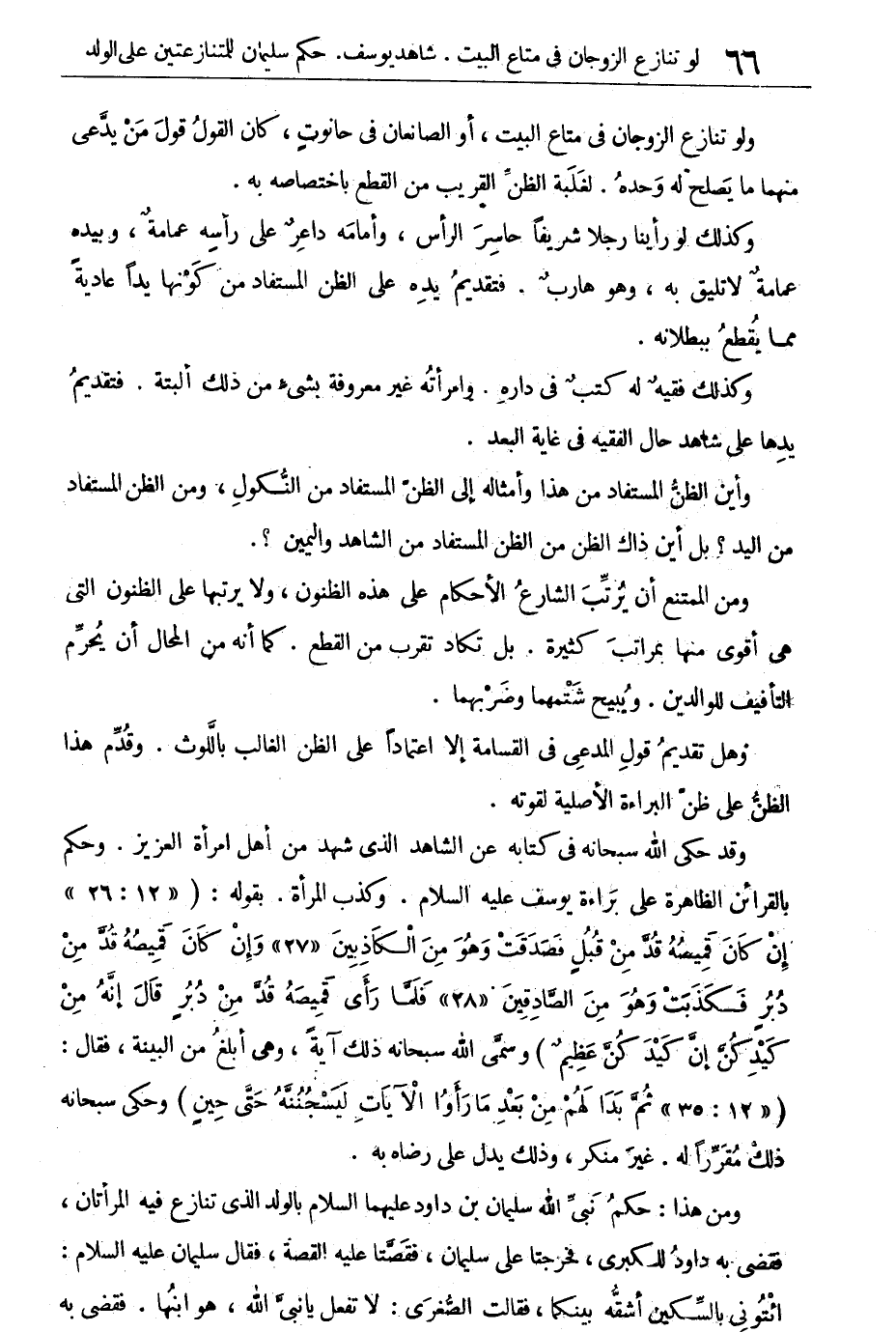 وقد حكى الله سبحانه فى كتابه عن الشاهد الذى شهد من أهل امرأة العزيز. وحكم بالقرائن الظاهرة على براءة يوسف عليه السلام. وكذب المرأة بقوله: {إِنْ كانَ قَمِيصُهُ قُدَّ مِنْ قُبُلٍ فَصَدَقَتْ وَهُوَ مِنَ الْكَاذِبِينَ وَإِنْ كانَ قَمِيصُهُ قُدَّ مِنْ دُبُرٍ فَكَذَبَتْ وَهُوَ مِنَ الصَّادِقِينَ فَلَمَّا رَأَى قَمِيصَهُ قُدَّ مِنْ دُبُرِ قَالَ إِنَّهُ مِنْ كَيْدِكُنَّ إِنَّ كَيْدَكنَّ عَظِيمٌ} [يوسف: 26 - 28] .