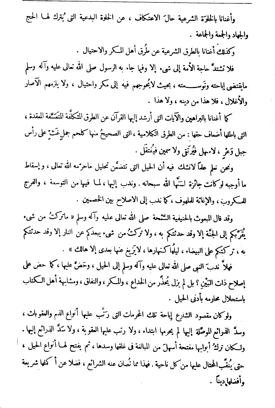 فلا تشتد حاجة الأمة إلى شئ إلا وفيما جاء به الرسول صلى الله تعالى عليه وآله وسلم ما يقتضى إباحته وتوسعته، بحيث لا يحوجهم فيه إلى مكر واحتيال، ولا يلزمهم الآصار والأغلال، فلا هذا من دينه، ولا هذا. كما أغنانا بالبراهين والآيات التى أرشد إليها القرآن عن الطرق المتكلفة المتعسفة المعقدة، التى باطلها أضعاف حقها: من الطرق الكلامية، التى الصحيح منها كلحم جمل غث على رأس جبل وعر، لا سهل فيرتقى ولا سمين فينتقل.