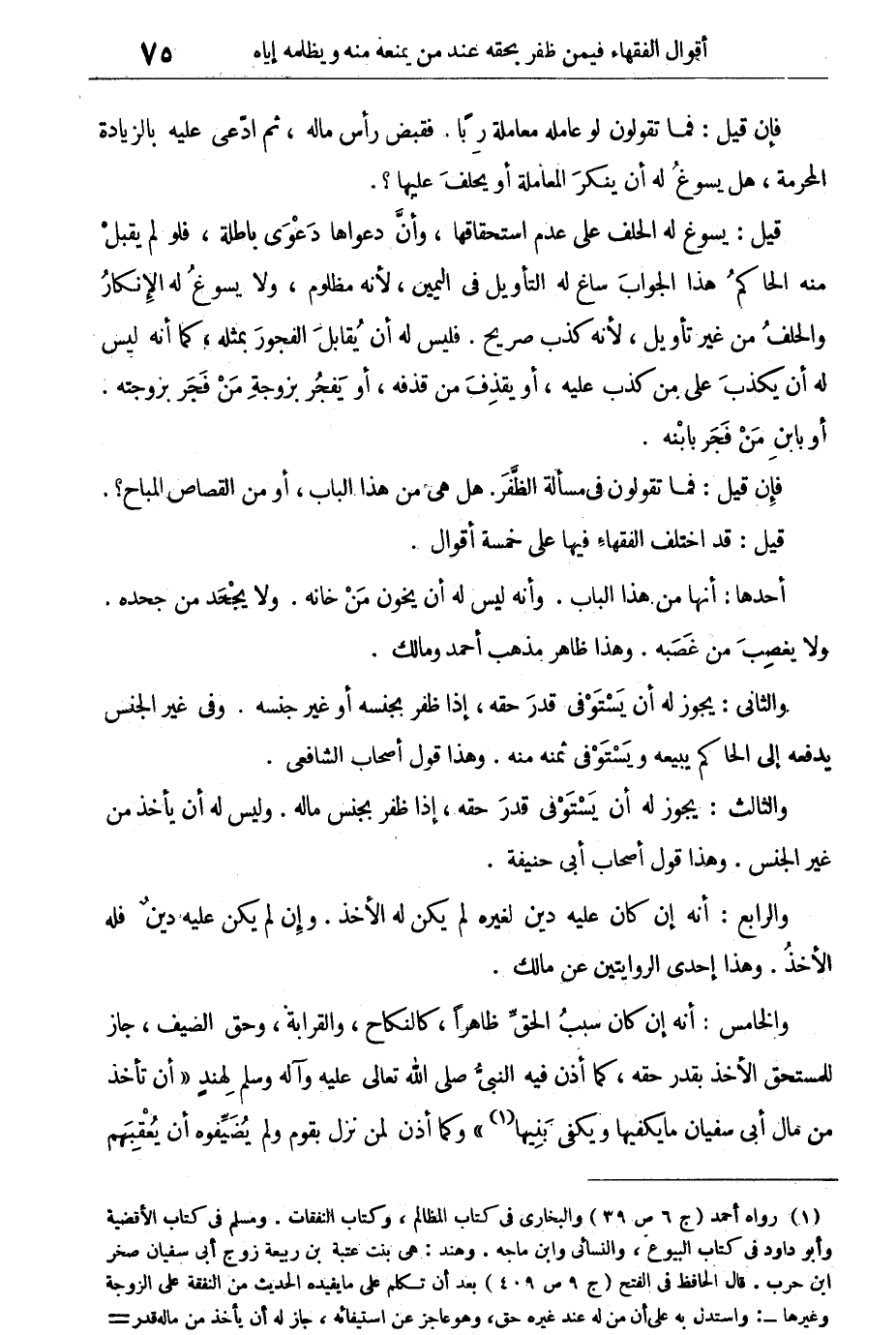 والخامس: أنه إن كان سبب الحق ظاهراً، كالنكاح، والقرابة، وحق الضيف، جاز للمستحق الأخذ بقدر حقه، كما أذن فيه النبى صلى الله تعالى عليه وآله وسلم لهند. "أَنْ تَأْخُذَ مِنْ مَالِ أَبى سُفْيَانَ مَا يَكْفِيهَا وَيَكْفِى بَنِيهَا".