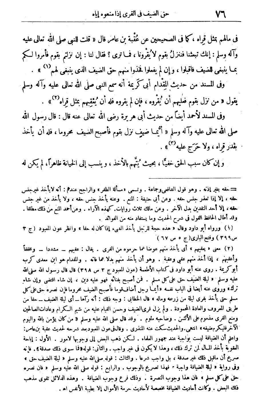 وفى المسند من حديث المقْدام أبى كريمة أنه سمع النبى صلى الله تعالى عليه وآله وسلم يقول: "مَنْ نَزَلَ بِقَوْمٍ فَعَلَيْهِمْ أَنْ يُقْرُوهُ، فَإِنْ لَمْ يُقْرُوهُ فله أَنْ يُعْقِبَهُمْ بمِثْلِ قِرَاهُ".