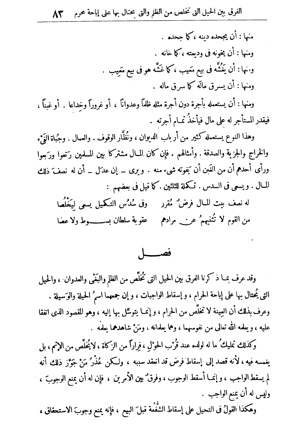 وقد عرف بما ذكرنا الفرق بين الحيل التى تخلص من الظلم والبغى والعدوان، والحيل التى يحتال بها على إباحة الحرام، وإسقاط الواجبات، وإن جمعهما اسم الحيلة والوسيلة. وعرف بذلك أن العينة لا تخلص من الحرام، وإنما يتوسل بها إليه، وهو المقصود الذى اتفقا عليه، ويعلمه الله تعالى من نفوسهما وهما يعلمانه، ومن شاهدهما يعلمه.