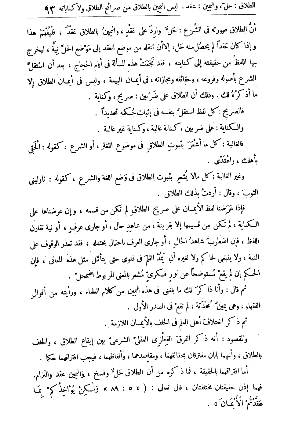 أن الطلاق صورته فى الشرع. حل وارد على عقد، واليمين بالطلاق عَقد فليفهم هذا. وإذا كان عقدا لم يحصل منه حل إلا أن تنقله من موضع العقد إلى موضع الحل بنية، ليخرج بها اللفظ من حقيقته إلى كنايته، فقد نجمت هذه المسألة فى أيام الحجاج بعد أن استقل الشرع بأصوله وفروعه، وحقائقه ومجازاته، فى أيمان البيعة، وليس فى أيمان الطلاق إلا ما أذكره لك. وذلك أن الطلاق على ضربين: صريح، وكناية.
