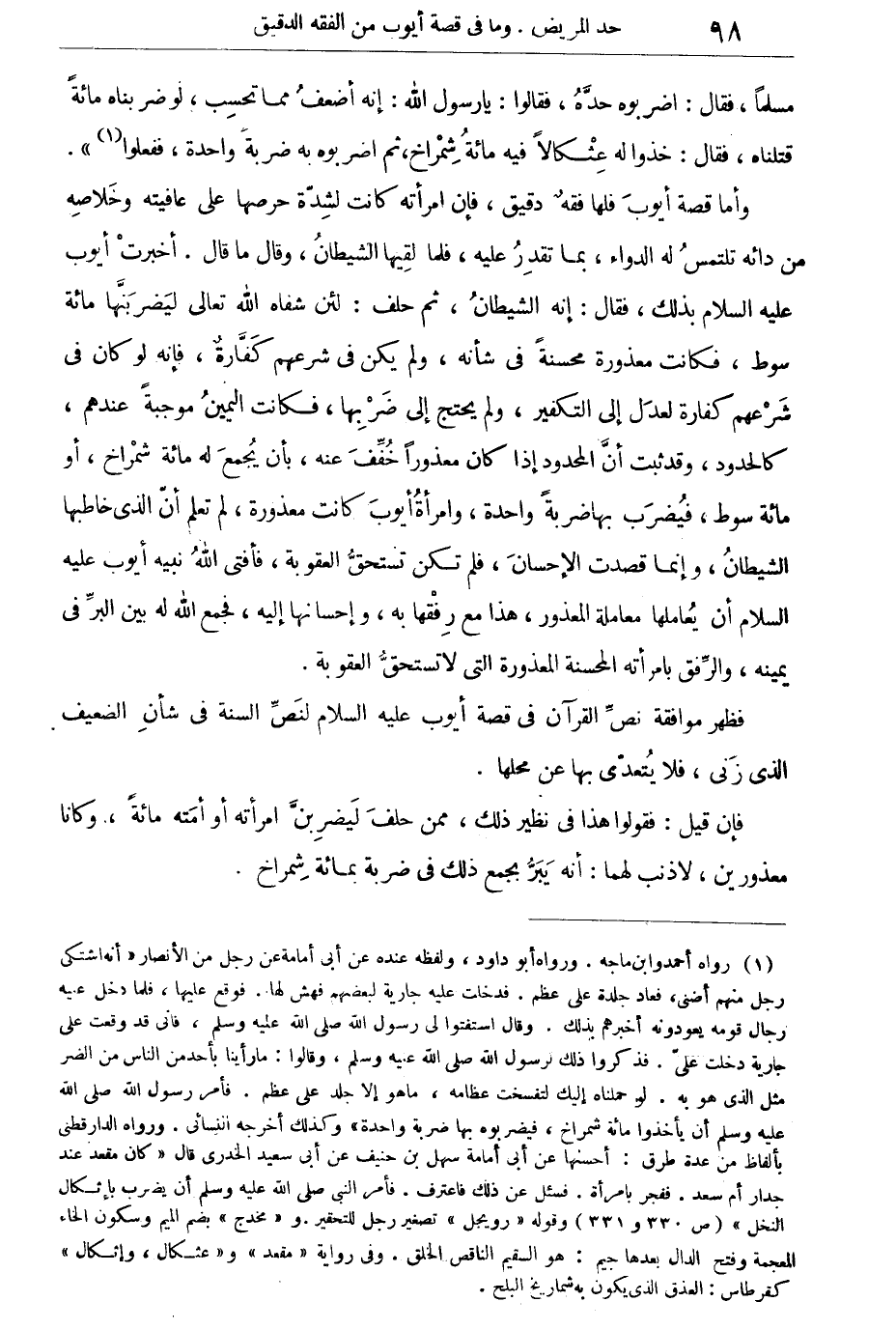 وأما قصة أيوب فلها فقه دقيق، فإن امرأته كانت لشدة حرصها على عافيته وخلاصه من دائه تلتمس له الدواء بما تقدر عليه. فلما لقيها الشيطان وقال ما قال، أخبرت أيوب عليه السلام بذلك، فقال: إنه الشيطان، ثم حلف: لئن شفاه الله تعالى ليضربنها مائة سوط، فكانت معذورة محسنة فى شأنه، ولم يكن فى شرعهم كفارة، فإنه لو كان فى شرعهم كفارة لعدل إلى التكفير، ولم يحتج إلى ضربها، فكانت اليمين موجبة عندهم، كالحدود، وقد ثبت أن المحدود إذا كان معذوراً خفف عنه، بأن يجمع له مائة شمراخ، أو مائة سوط، فيضرب بها ضربة واحدة، وامرأة أيوب كانت معذورة، لم تعلم أن الذى خاطبها الشيطان، وإنما قصدت الإحسان، فلم تكن تستحق العقوبة، فأفتى الله نبيه أيوب عليه السلام أن يعاملها معاملة المعذور، هذا مع رفقها به، وإحسانها إليه، فجمع الله له بين البر فى يمينه، والرفق بامرأته المحسنة المعذورة التى لا تستحق العقوبة. فظهر موافقة نص القرآن فى قصة أبوب عليه السلام لنص السنة فى شأن الضعيف الذى زنى، فلا يتعدى بها عن محلها.