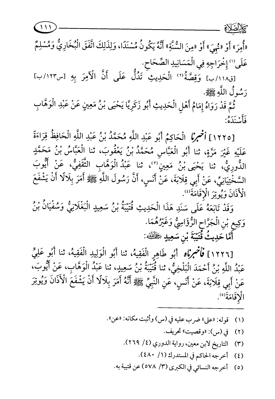 [1226] فأخبرناه أَبُو طَاهِرٍ الْفَقِيهُ، ثنا أَبُو الْوَلِيدِ الْفَقِيهُ، ثنا أَبُو عَلِيٍّ عَبْدُ اللَّهِ بْنُ أَحْمَدَ الْبَلْخِيُّ، ثنا قُتَيْبَةُ بْنُ سَعِيدٍ، ثنا عَبْدُ الْوَهَّابِ، عَنْ أَيُّوبَ، عَنْ أَبِي قِلَابَةَ، عَنْ أَنَسٍ، عَنِ النَّبِيِّ - صلى الله عليه وسلم - أَنَّهُ أَمَرَ بِلَالًا أَنْ يَشْفَعَ الْأَذَانَ وَيُوتِرَ الْإِقَامَةَ (¬5).
