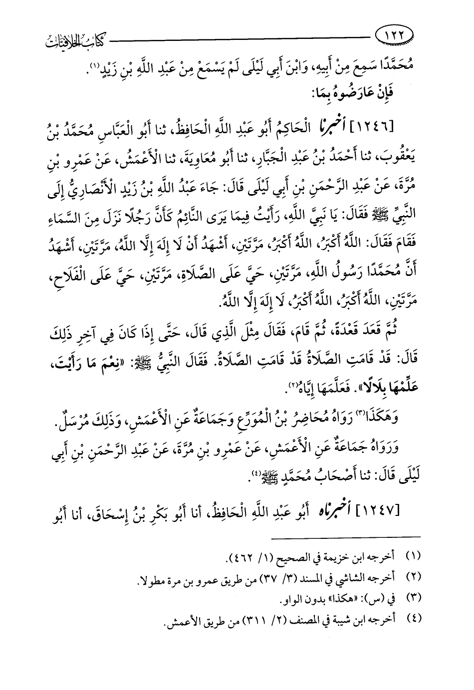 [1246] أخبرنا الْحَاكِمُ أَبُو عَبْدِ اللَّهِ الْحَافِظُ، ثنا أَبُو الْعَبَّاسِ مُحَمَّدُ بْنُ يَعْقُوبَ، ثنا أَحْمَدُ بْنُ عَبْدِ الْجَبَّارِ، ثنا أَبُو مُعَاوِيَةَ، ثنا الْأَعْمَشُ، عَنْ عَمْرِو بْنِ مُرَّةَ، عَنْ عَبْدِ الرَّحْمَنِ بْنِ أَبِي لَيْلَى قَالَ: جَاءَ عَبْدُ اللَّهِ بْنُ زَيْدٍ الْأَنْصَارِيُّ إِلَى النَّبِيِّ - صلى الله عليه وسلم - فقَالَ: يَا نَبِيَّ اللَّهِ، رَأَيْتُ فِيمَا يَرَى النَّائِمُ كَأَنَّ رَجُلًا نَزَلَ مِنَ السَّمَاءِ فَقَامَ فَقَالَ: اللَّهُ أَكْبَرُ، اللَّهُ أَكْبَرُ، مَرَّتَيْنِ، أَشْهَدُ أَنْ لَا إِلَهَ إِلَّا اللَّهُ، مَرَّتَيْنِ، أَشْهَدُ أَنَّ مُحَمَّدًا رَسُولُ اللَّهِ، مَرَّتَيْنِ، حَيَّ عَلَى الصَّلَاةِ، مَرَّتَيْنِ، حَيَّ عَلَى الْفَلَاحِ، مَرَّتَيْنِ، اللَّهُ أَكْبَرُ، اللَّهُ أَكْبَرُ، لَا إِلَهَ إِلَّا اللَّهُ.