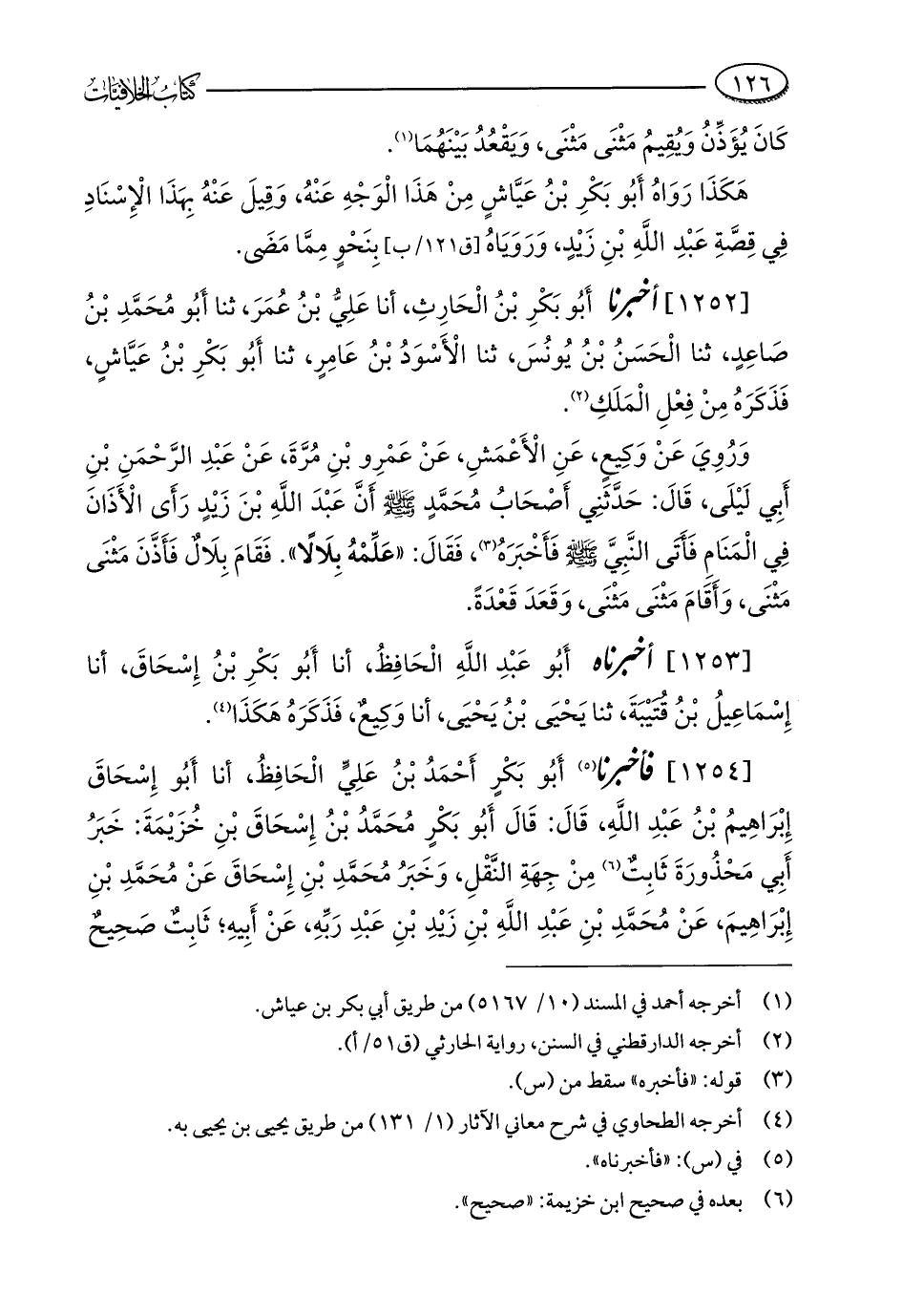 [1254] فأخبرنا (¬5) أَبُو بَكْرٍ أَحْمَدُ بْنُ عَلِيٍّ الْحَافِظُ، أنا أَبُو إِسْحَاقَ إِبْرَاهِيمُ بْنُ عَبْدِ اللَّهِ، قَالَ: قَالَ أَبُو بَكْرٍ مُحَمَّدُ بْنُ إِسْحَاقَ بْنِ خُزَيْمَةَ: خَبَرُ أَبِي مَحْذُورَةَ ثَابِتٌ (¬6) مِنْ جِهَةِ النَّقْلِ، وَخَبَرُ مُحَمَّدِ بْنِ إِسْحَاقَ عَنْ مُحَمَّدِ بْنِ إِبْرَاهِيمَ، عَنْ مُحَمَّدِ بْنِ عَبْدِ اللَّهِ بْنِ زيدِ بْنِ عَبْدِ رَبِّهِ، عَنْ أَبِيهِ؛ ثَابِتٌ صَحِيحٌ