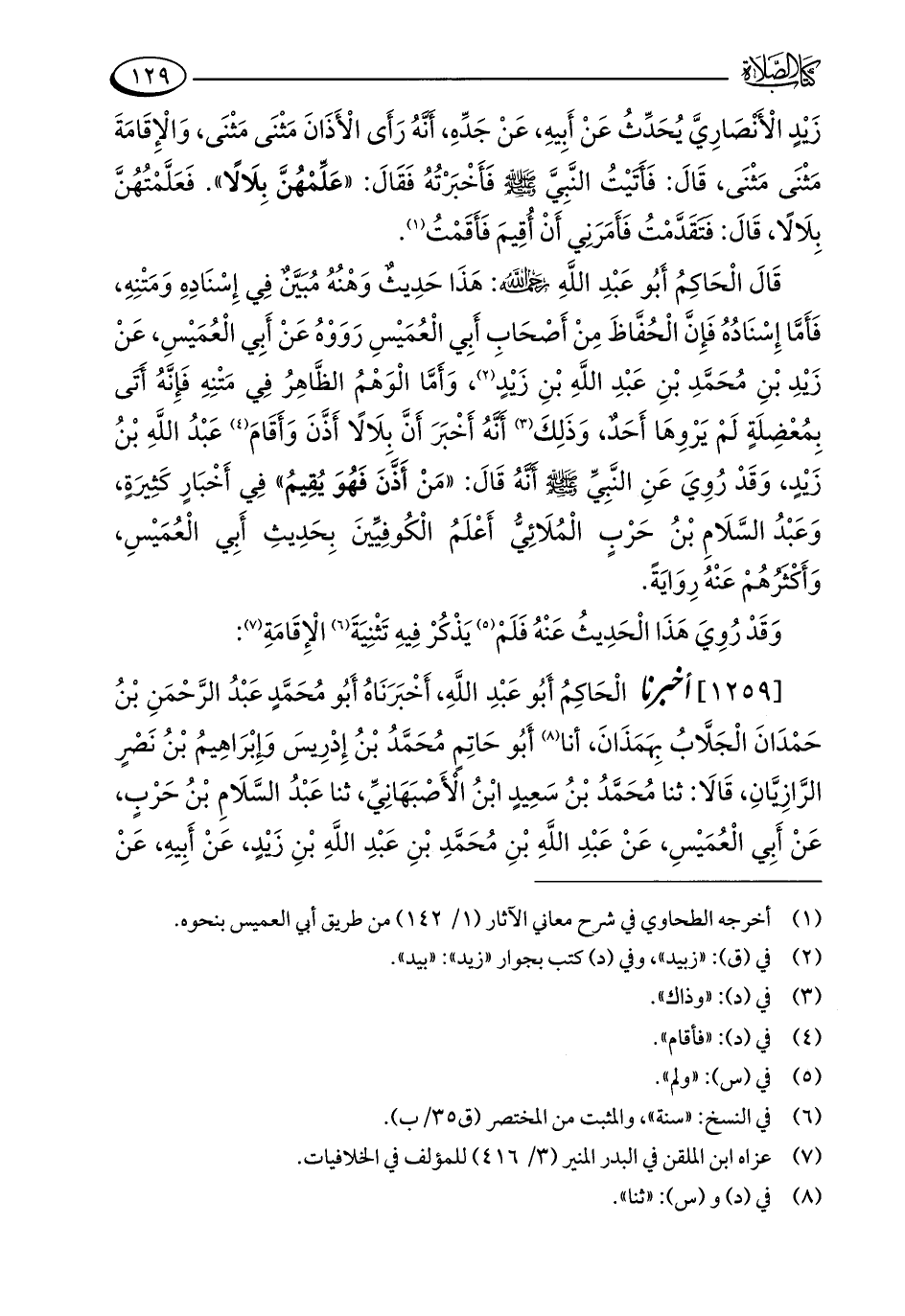 زَيْدٍ الْأَنْصَارِيَّ يُحَدِّثُ عَنْ أَبِيهِ، عَنْ جَدِّهِ، أَنَّهُ رَأَى الْأَذَانَ مَثْنَى مَثْنَى، وَالْإِقَامَةَ مَثْنَى مَثْنَى، قَالَ: فَأَتيْتُ النَّبِيَّ - صلى الله عليه وسلم - فأَخْبَرْتُهُ فَقَالَ: "عَلِّمْهُنَّ بِلَالًا". فَعَلَّمْتُهُنَّ بِلَالًا، قَالَ: فَتَقَدَّمْتُ فَأَمَرَنِي أَنْ أُقِيمَ فَأَقَمْتُ (¬1).