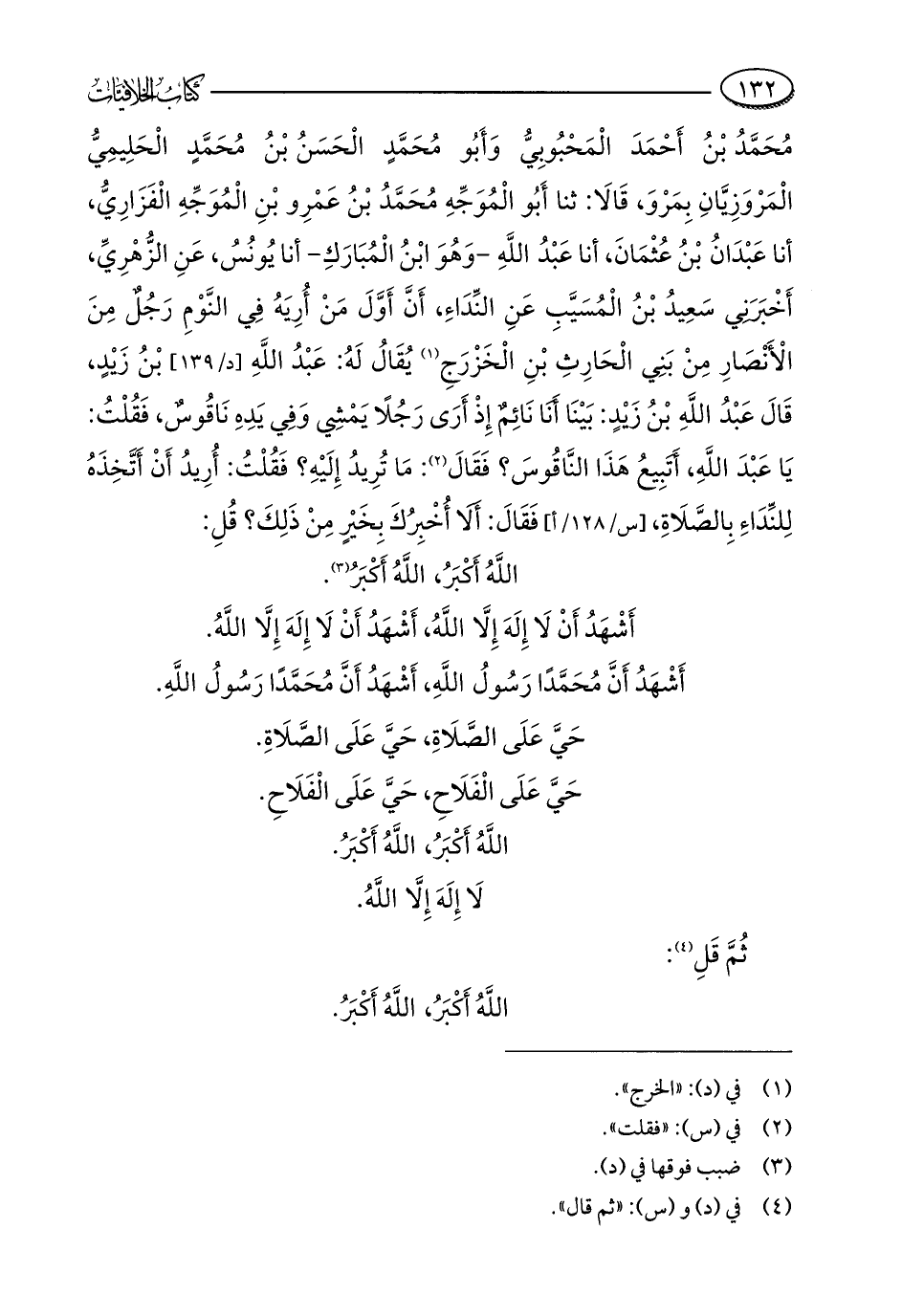 مُحَمَّدُ بْنُ أَحْمَدَ الْمَحْبُوبِيُّ وَأَبُو مُحَمَّدٍ الْحَسَنُ بْنُ مُحَمَّدٍ الْحَلِيمِيُّ الْمَرْوَزِيَّانِ بِمَرْوَ، قَالَا: ثنا أَبُو الْمُوَجِّهِ مُحَمَّدُ بْنُ عَمْرِو بْنِ الْمُوَجِّهِ الْفَزَارِيُّ، أنا عَبْدَانُ بْنُ عُثْمَانَ، أنا عَبْدُ اللَّهِ - وَهُوَ ابْنُ الْمُبَارَكِ - أنا يُونُسُ، عَنِ الزُّهْرِيِّ، أَخْبَرَنِي سَعِيدُ بْنُ الْمُسَيَّبِ عَنِ النِّدَاءِ، أَنَّ أَوَّلَ مَنْ أُرِيَهُ فِي النَّوْمِ رَجُلٌ مِنَ الْأَنْصَارِ مِنْ بَنِي الْحَارِثِ بْنِ الْخَزْرَجِ (¬1) يُقَالُ لَهُ: عَبْدُ اللَّهِ بْنُ زَيْدٍ، قَالَ عَبْدُ اللَّهِ بْنُ زَيْدٍ: بَيْنَا أَنَا نَائِمٌ إِذْ أَرَى رَجُلًا يَمْشِي وَفِي يَدِهِ نَاقُوسٌ، فَقُلْتُ: يَا عَبْدَ اللَّهِ، أَتَبِيعُ هَذَا النَّاقُوسَ؟ فَقَالَ (¬2): مَا تُرِيدُ إِلَيْهِ؟ فَقُلْتُ: أُرِيدُ أَنْ أتَّخِذَهُ لِلنِّدَاءِ بِالصَّلَاةِ، فَقَالَ: أَلَا أُخْبِرُكَ بِخَيْرٍ مِنْ ذَلِكَ؟ قُلِ: