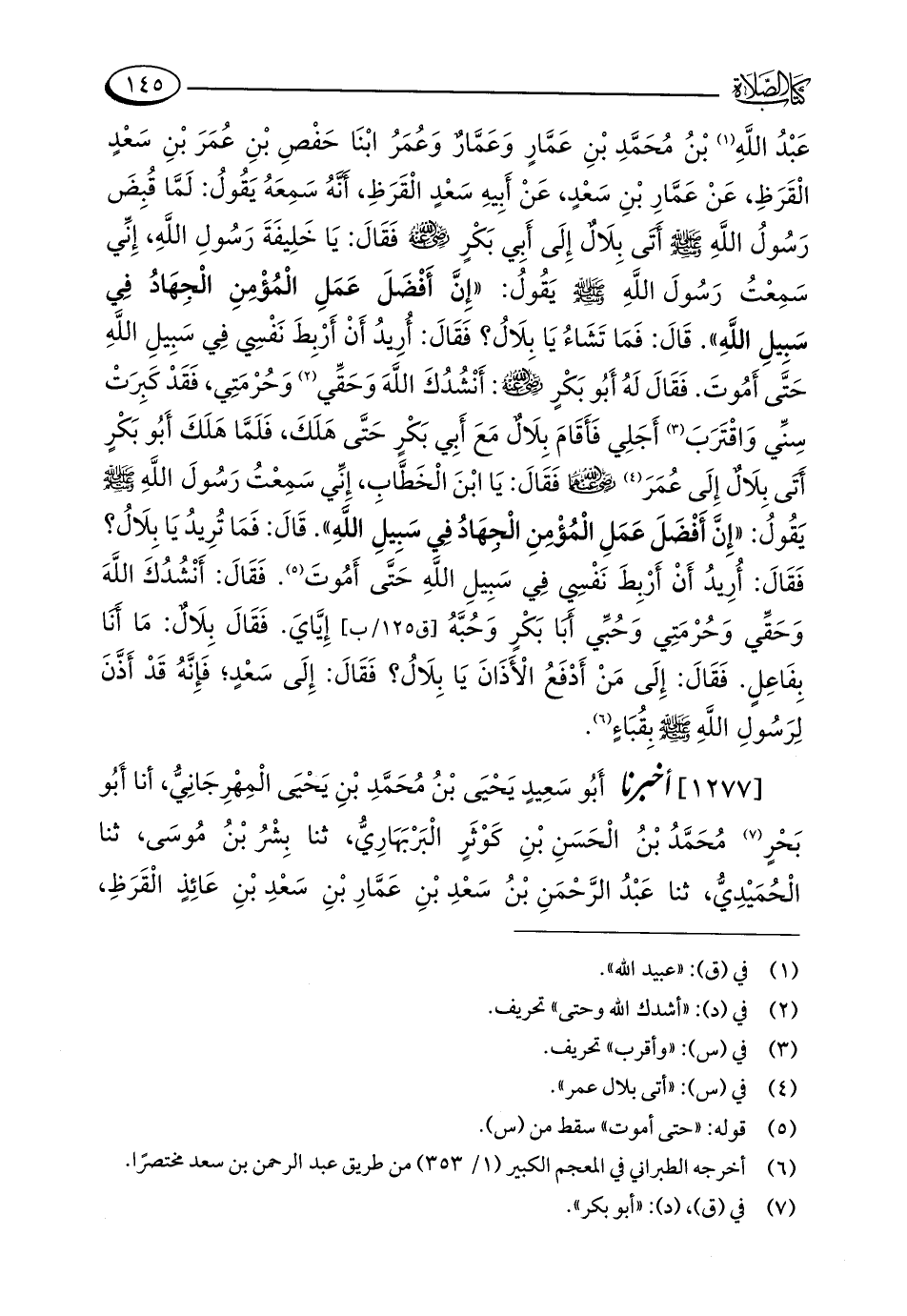 عَبْدُ اللَّهِ (¬1) بْنُ مُحَمَّدِ بْنِ عَمَّارٍ وَعَمَّارٌ وَعُمَرُ ابْنَا حَفْصِ بْنِ عُمَرَ بْنِ سَعْدٍ الْقَرَظِ، عَنْ عَمَّارِ بْنِ سَعْدٍ، عَنْ أَبِيهِ سَعْدٍ الْقَرَظِ، أنَّهُ سَمِعَهُ يَقُولُ: لَمَّا قُبِضَ رَسُولُ اللَّهِ - صلى الله عليه وسلم - أَتَى بِلَالٌ إِلَى أَبِي بَكْرٍ - رضي الله عنه - فَقَالَ: يَا خَلِيفَةَ رَسُولِ اللَّهِ، إِنِّي سَمِعْتُ رَسُولَ اللَّهِ - صلى الله عليه وسلم - يقُولُ: "إِنَّ أَفْضَلَ عَمَلِ الْمُؤْمِنِ الْجِهَادُ فِي سَبِيلِ اللَّهِ". قَالَ: فَمَا تَشَاءُ يَا بِلَالُ؟ فَقَالَ: أُرِيدُ أَنْ أَرْبِطَ نَفْسِي فِي سَبِيلِ اللَّهِ حَتَّى أَمُوتَ. فَقَالَ لَهُ أَبُو بَكْرٍ - رضي الله عنه -: أَنْشُدُكَ اللَّهَ وَحَقِّي (¬2) وَحُرْمَتِي، فَقَدْ كَبِرَتْ سِنِّي وَاقْتَرَبَ (¬3) أَجَلِي فَأَقَامَ بِلَالٌ مَعَ أَبِي بَكْرٍ حَتَّى هَلَكَ، فَلَمَّا هَلَكَ أَبُو بَكْرٍ أَتَى بِلَالٌ إِلَى عُمَرَ (¬4) - رضي الله عنهما - فَقَالَ: يَا ابْنَ الْخَطَّابِ، إِنِّي سَمِعْتُ رَسُولَ اللَّهِ - صلى الله عليه وسلم - يَقُولُ: "إِنَّ أَفْضَلَ عَمَلِ الْمُؤْمِنِ الْجِهَادُ فِي سَبِيلِ اللَّهِ". قَالَ: فَمَا تُرِيدُ يَا بِلَالُ؟ فَقَالَ: أُرِيدُ أَنْ أَرْبِطَ نَفْسِي فِي سَبِيلِ اللَّهِ حَتَّى أَمُوتَ (¬5). فَقَالَ: أَنْشُدُكَ اللَّهَ وَحَقِّي وَحُرْمَتِي وَحُبِّي أبا بَكْرٍ وَحُبَّهُ إِيَّايَ. فَقَالَ بِلَالٌ: مَا أَنا بِفَاعِلٍ. فَقَالَ: إِلَى مَنْ أَدْفَعُ الْأَذَانَ يَا بِلَالُ؟ فَقَالَ: إِلَى سَعْدٍ؛ فَإِنَّهُ قَدْ أَذَّنَ لِرَسُولِ اللَّهِ - صلى الله عليه وسلم - بِقُبَاءٍ (¬6).