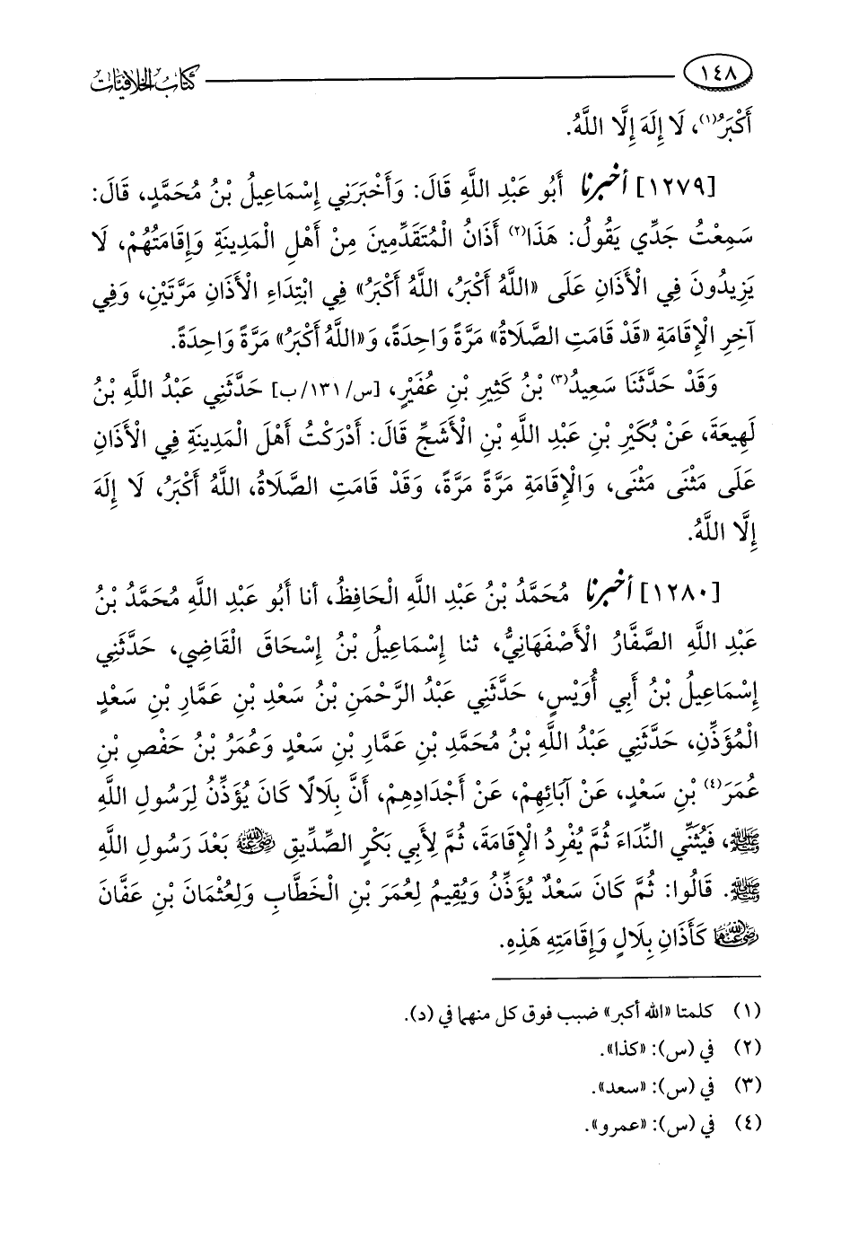 [1280] أخبرنا مُحَمَّدُ بْنُ عَبْدِ اللَّهِ الْحَافِظُ، أنا أَبُو عَبْدِ اللَّهِ مُحَمَّدُ بْنُ عَبْدِ اللَّهِ الصَّفَّارُ الْأَصْفَهَانِيُّ، ثنا إِسْمَاعِيلُ بْنُ إِسْحَاقَ الْقَاضِي، حَدَّثَنِي إِسْمَاعِيلُ بْنُ أَبِي أُوَيْسٍ، حَدَّثَنِي عَبْدُ الرَّحْمَنِ بْنُ سَعْدِ بْنِ عَمَّارِ بْنِ سَعْدٍ الْمُؤَذِّنِ، حَدَّثَنِي عَبْدُ اللَّهِ بْنُ مُحَمَّدِ بْنِ عَمَّارِ بْنِ سَعْدٍ وَعُمَرُ بْنُ حَفْصِ بْنِ عُمَرَ (¬4) بْنِ سَعْدٍ، عَنْ آبَائِهِمْ، عَنْ أَجْدَادِهِمْ، أَنَّ بِلَالًا كَانَ يُؤَذِّنُ لِرَسُولِ اللَّهِ - صلى الله عليه وسلم -، فَيُثَنِّي النِّدَاءَ ثُمَّ يُفْرِدُ الْإِقَامَةَ، ثُمَّ لِأَبِي بَكْرٍ الصِّدِّيقِ - رضي الله عنه - بَعْدَ رَسُولِ اللَّهِ - صلى الله عليه وسلم -. قَالُوا: ثُمَّ كَانَ سَعْدٌ يُؤَذِّنُ وَيُقِيمُ لِعُمَرَ بْنِ الْخَطَّابِ وَلِعُثْمَانَ بْنِ عَفَّانَ - رضي الله عنهما - كَأَذَانِ بِلَالٍ وَإِقَامَتِهِ هَذِهِ.
