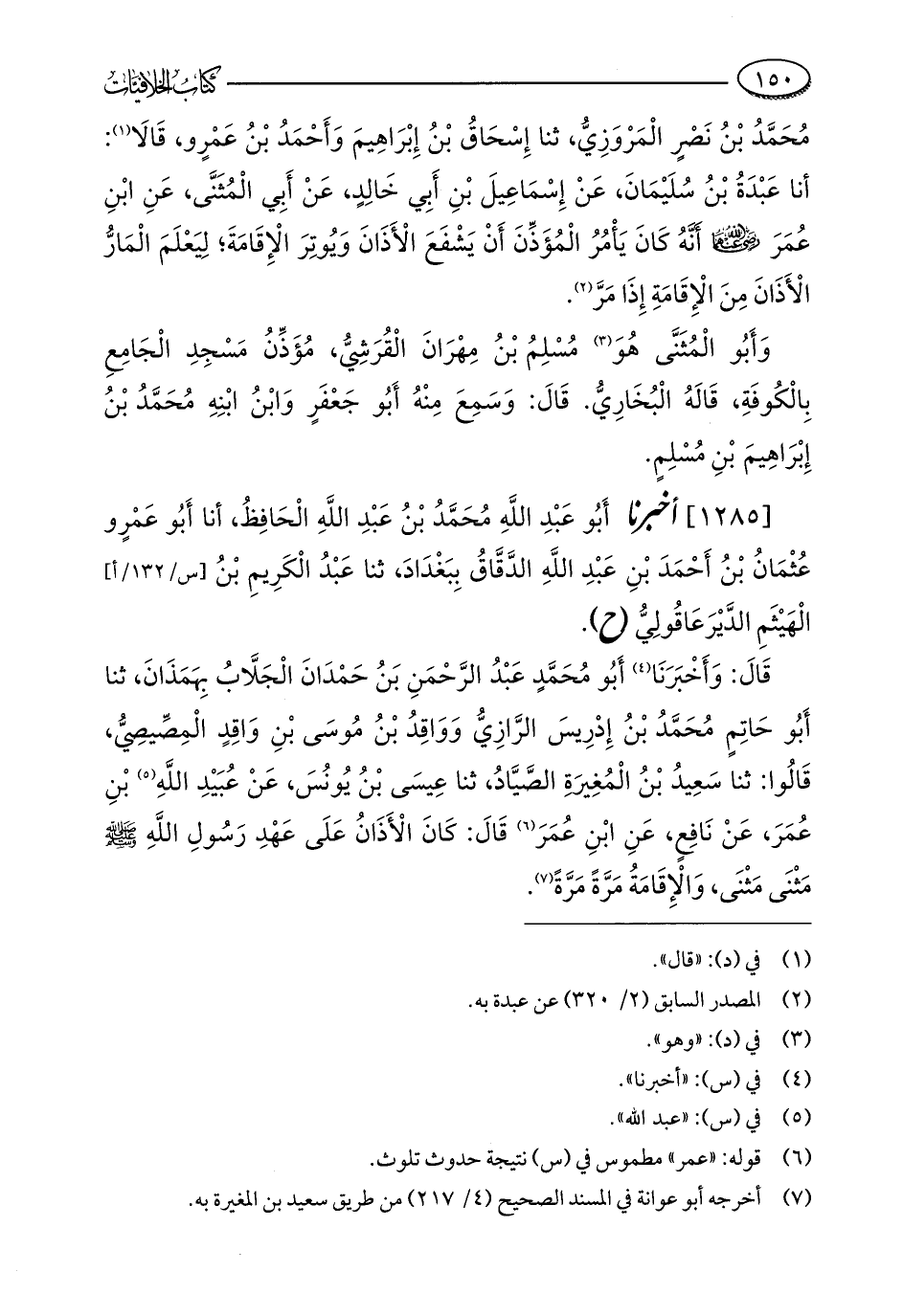 مُحَمَّدُ بْنُ نَصْرٍ الْمَرْوَزِيُّ، ثنا إِسْحَاقُ بْنُ إِبْرَاهِيمَ وَأَحْمَدُ بْنُ عَمْرٍو، قَالَا (¬1): أنا عَبْدَةُ بْنُ سُلَيْمَانَ، عَنْ إِسْمَاعِيلَ بْنِ أَبِي خَالِدٍ، عَنْ أَبِي الْمُثَنَّى، عَنِ ابْنِ عُمَرَ - رضي الله عنهما - أَنَّهُ كَانَ يَأْمُرُ الْمُؤَذِّنَ أَنْ يَشْفَعَ الْأَذَانَ وَيُوتِرَ الْإِقَامَةَ؛ لِيَعْلَمَ الْمَارُّ الْأَذَانَ مِنَ الْإِقَامَةِ إِذَا مَرَّ (¬2).