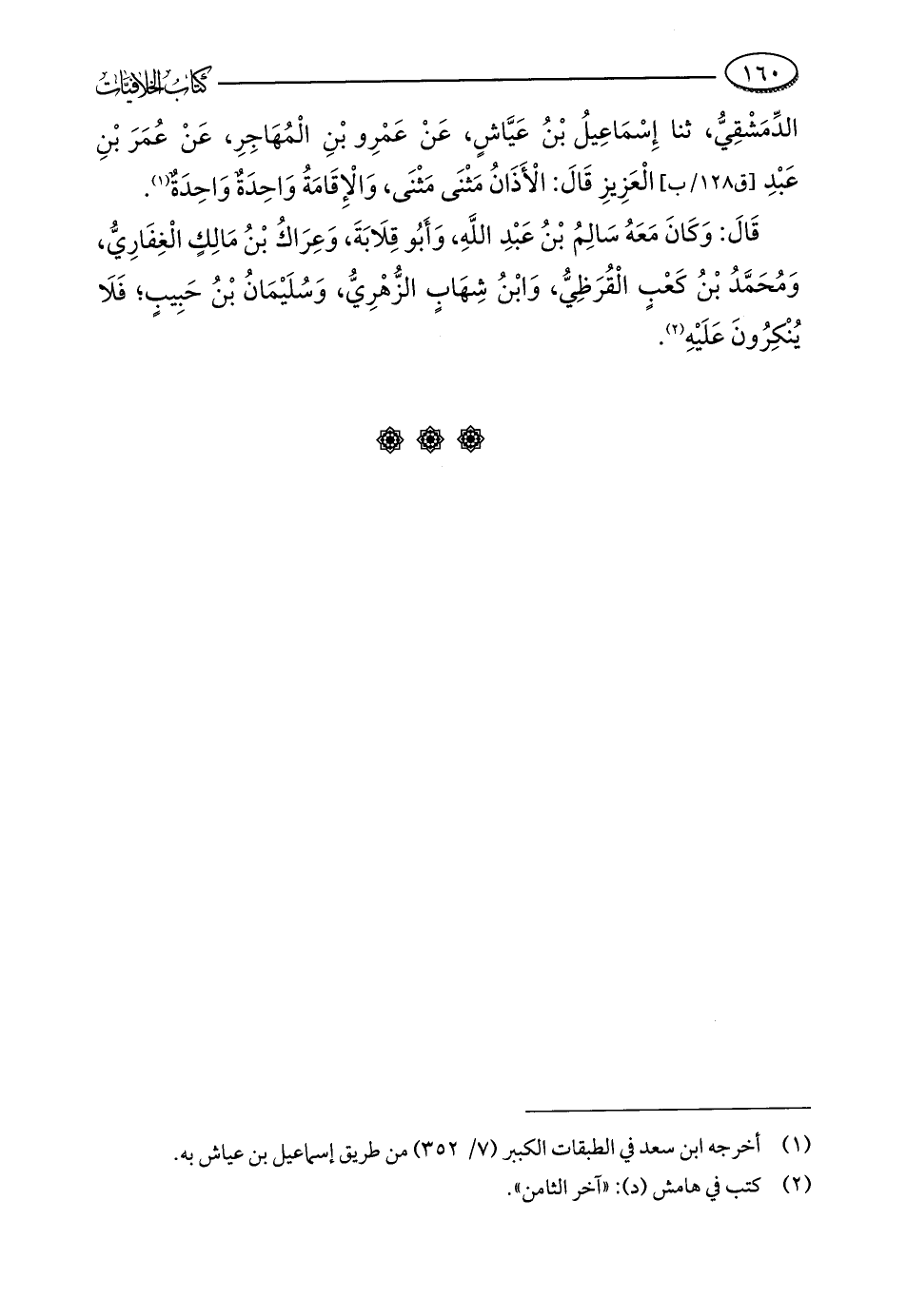 الدِّمَشْقِيُّ، ثنا إِسْمَاعِيلُ بْنُ عَيَّاشٍ، عَنْ عَمْرِو بْنِ الْمُهَاجِرِ، عَنْ عُمَرَ بْنِ عَبْدِ الْعَزِيزِ قَالَ: الْأَذَانُ مَثْنَى مَثْنَى، وَالْإِقَامَةُ وَاحِدَةٌ وَاحِدَةٌ (¬1).