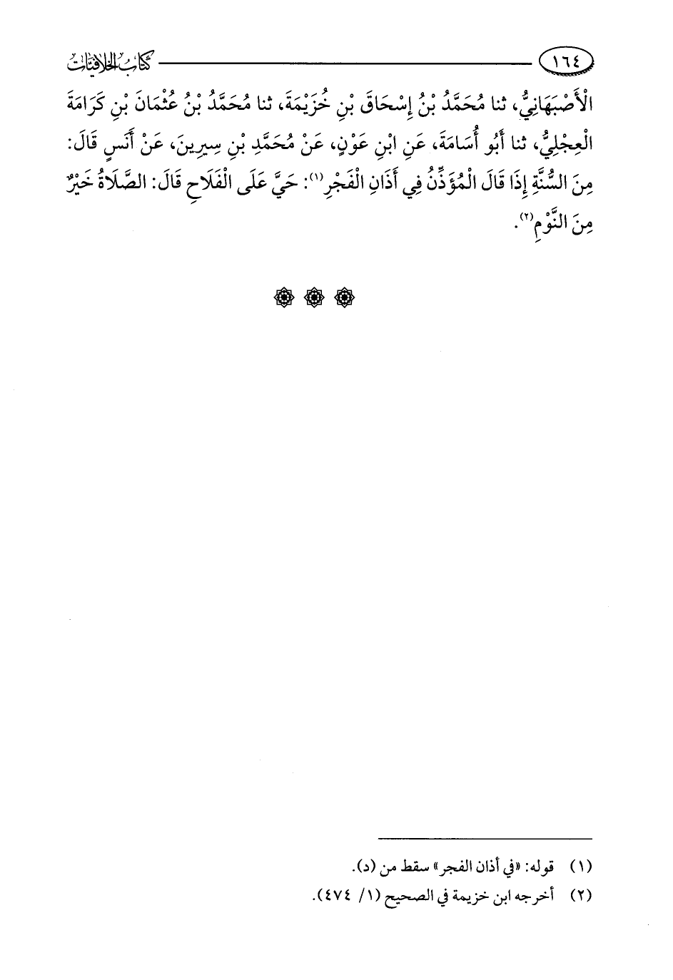 الْأَصْبَهَانِيُّ، ثنا مُحَمَّدُ بْنُ إِسْحَاقَ بْنِ خُزَيْمَةَ، ثنا مُحَمَّدُ بْنُ عُثْمَانَ بْنِ كَرَامَةَ الْعِجْلِيُّ، ثنا أبُو أُسَامَةَ، عَنِ ابْنِ عَوْنٍ، عَنْ مُحَمَّدِ بْنِ سِيرِينَ، عَنْ أَنَسٍ قَالَ: مِنَ السُّنَّةِ إِذَا قَالَ الْمُؤَذِّنُ فِي أَذَانِ الْفَجْرِ (¬1): حَيَّ عَلَى الْفَلَاحِ قَالَ: الصَّلَاةُ خَيْرٌ مِنَ النَّوْمِ (¬2).