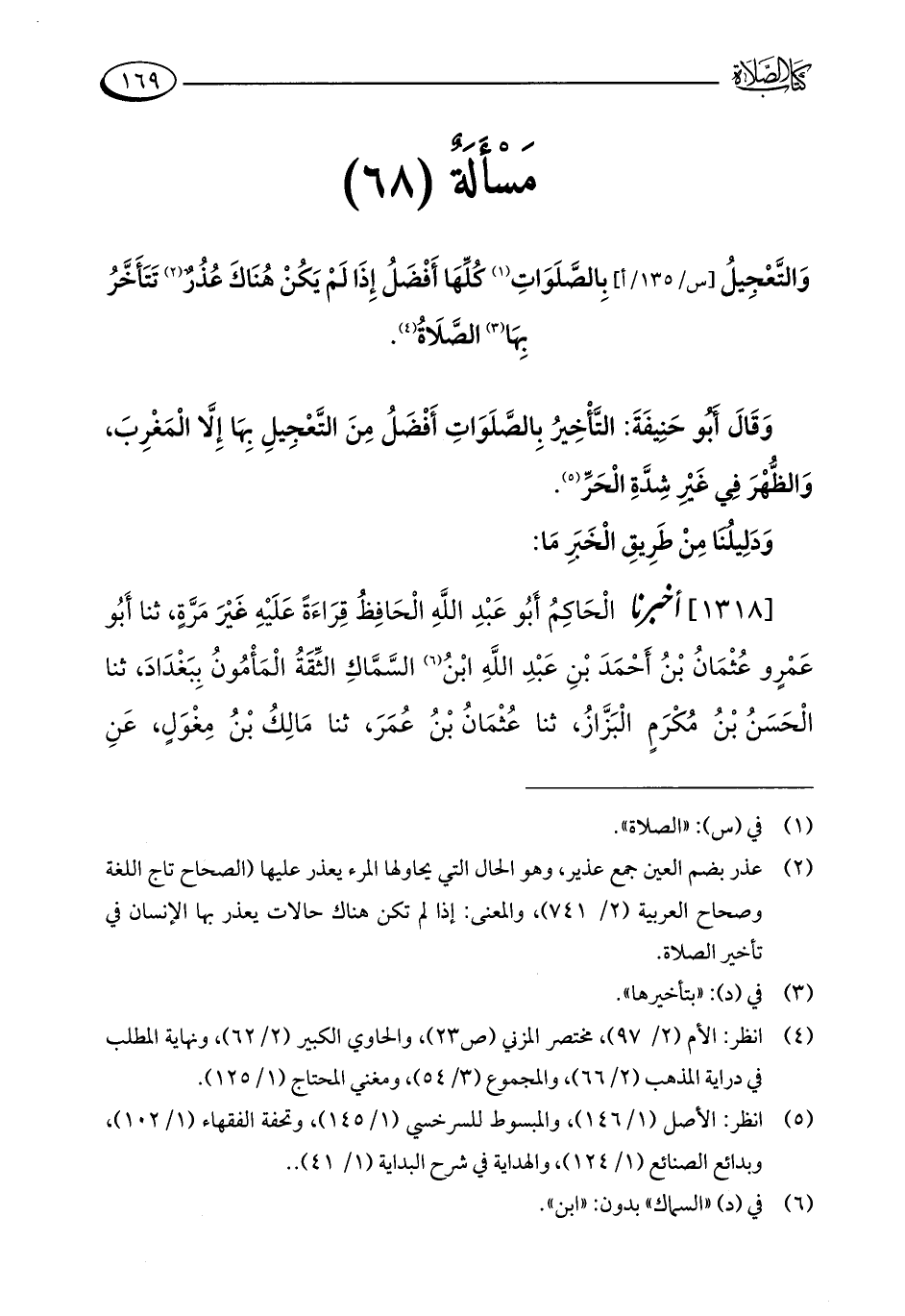 مَسْأَلَةٌ (68): وَالتَّعْجِيلُ بِالصَّلَوَاتِ (¬1) كُلِّهَا أَفْضَلُ إِذَا لَمْ يَكُنْ هُنَاكَ عُذُرٌ (¬2) تَتَأَخَّرُ بِهَا (¬3) الصَّلَاةُ (¬4).