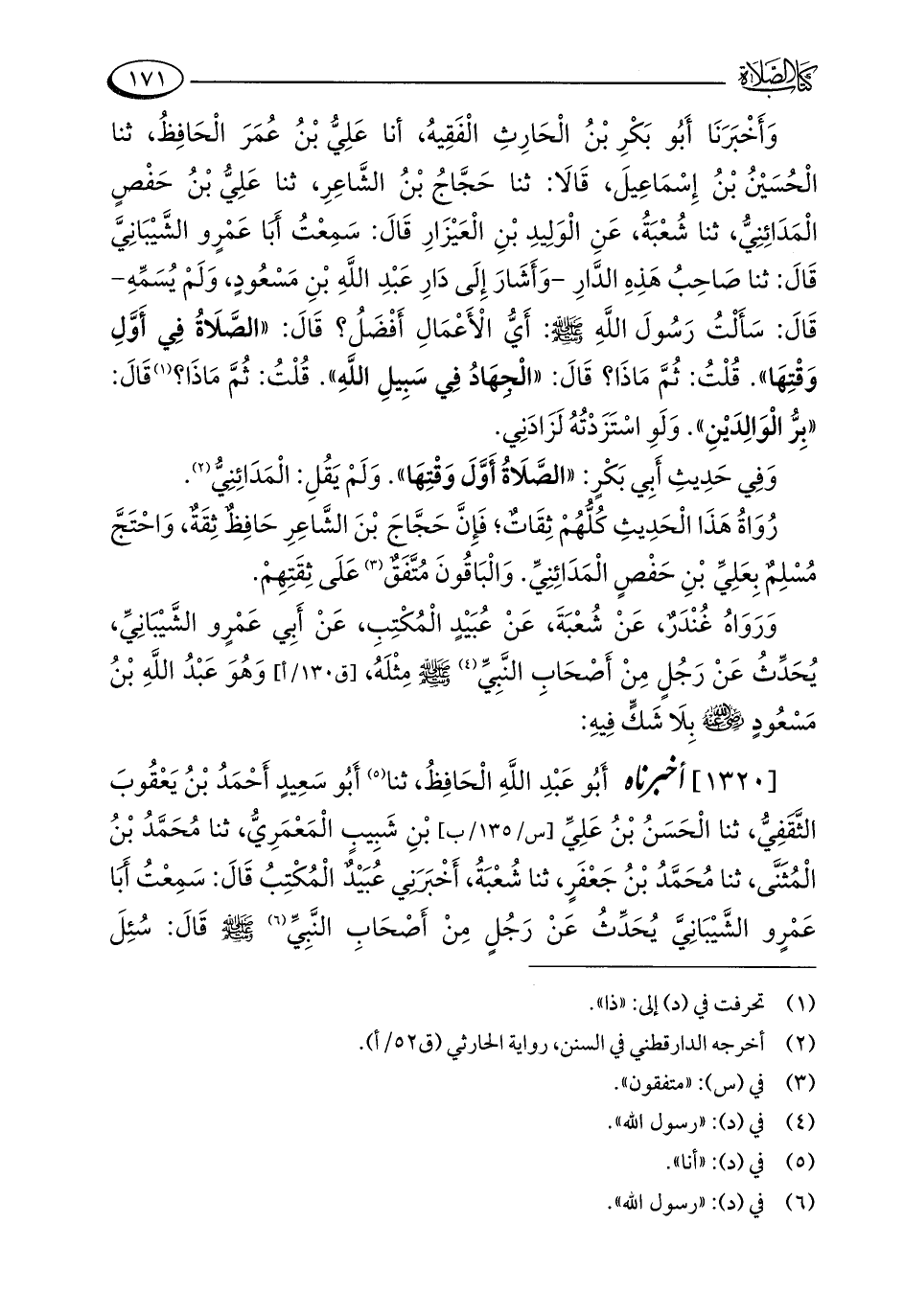 وَأَخْبَرَنَا أَبُو بَكْرِ بْنُ الْحَارِثِ الْفَقِيهُ، أنا عَلِيُّ بْنُ عُمَرَ الْحَافِظُ، ثنا الْحُسَيْنُ بْنُ إِسْمَاعِيلَ، قَالَا: ثنا حَجَّاجُ بْنُ الشَّاعِرِ، ثنا عَلِيُّ بْنُ حَفْصٍ الْمَدَائِنِيُّ، ثنا شُعْبَةُ، عَنِ الْوَلِيدِ بْنِ الْعَيْزَارِ قَالَ: سَمِعْتُ أبا عَمْرٍو الشَّيْبَانِيَّ قَالَ: ثنا صَاحِبُ هَذِهِ الدَّارِ - وَأَشَارَ إِلَى دَارِ عَبْدِ اللَّهِ بْنِ مَسْعُودٍ، وَلَمْ يُسَمِّهِ - قَالَ: سَأَلْتُ رَسُولَ اللَّهِ - صلى الله عليه وسلم -: أَيُّ الْأَعْمَالِ أَفْضَلُ؟ قَالَ: "الصَّلَاةُ فِي أَوَّلِ وَقْتِهَا". قُلْتُ: ثُمَّ مَاذَا؟ قَالَ: "الْجهَادُ فِي سَبِيلِ اللَّهِ". قُلْتُ: ثُمَّ مَاذَا؟ (¬1) قَالَ: "بِرُّ الْوَالِدَيْنِ". وَلَوِ اسْتَزَدْتُهُ لَزَادَنِي.