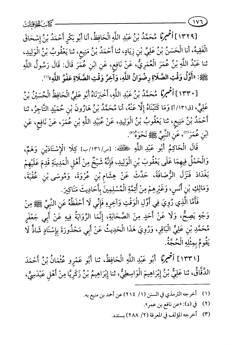 [1329] أخبرنا مُحَمَّدُ بْنُ عَبْدِ اللَّهِ الْحَافِظُ، أنا أَبُو بَكْرٍ أَحْمَدُ بْنُ إِسْحَاقَ الْفَقِيهُ، أنا الْحَسَنُ بْنُ عَلِيِّ بْنِ زِيادٍ، ثنا أَحْمَدُ بْنُ مَنِيعٍ، ثنا يَعْقُوبُ بْنُ الْوَلِيدِ، ثنا عَبْدُ اللَّهِ بْنُ عُمَرَ الْعُمَرِيُّ، عَنْ نَافِعٍ، عَنِ ابْنِ عُمَرَ قَالَ: قَالَ رَسُولُ اللَّهِ - صلى الله عليه وسلم -: "أَوَّلُ وَقْتِ الصَّلَاةِ رِضْوَانُ اللَّهِ، وَآخِرُ وَقْتِ الصَّلَاةِ عَفْوُ اللَّهِ" (¬1).