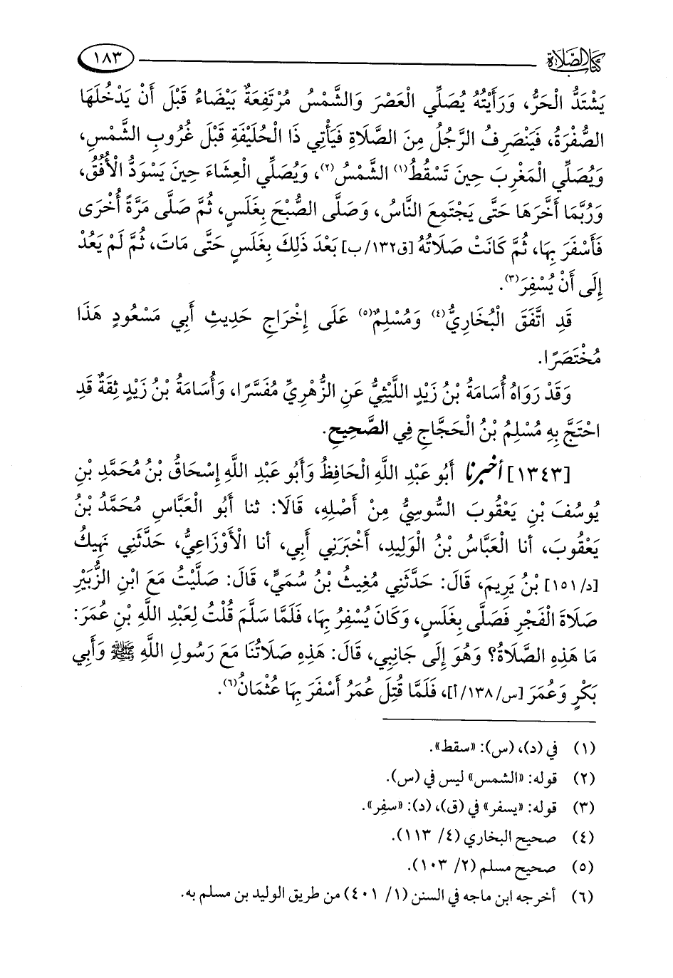 [1343] أخبرنا أَبُو عَبْدِ اللَّهِ الْحَافِظُ وَأَبُو عَبْدِ اللَّهِ إِسْحَاقُ بْنُ مُحَمَّدِ بْنِ يُوسُفَ بْنِ يَعْقُوبَ السُّوسِيُّ مِنْ أَصْلِهِ، قَالَا: ثنا أَبُو الْعَبَّاسِ مُحَمَّدُ بْنُ يَعْقُوبَ، أنا الْعَبَّاسُ بْنُ الْوَلِيدِ، أَخْبَرَنِي أَبِي، أنا الْأَوْزَاعِيُّ، حَدَّثَنِي نَهِيكُ بْنُ يَرِيمَ، قَالَ: حَدَّثَنِي مُغِيثُ بْنُ سُمَيٍّ، قَالَ: صَلَّيْتُ مَعَ ابْنِ الزُّبَيْرِ صَلَاةَ الْفَجْرِ فَصَلَّى بِغَلَسٍ، وَكَانَ يُسْفِرُ بِهَا، فَلَمَّا سَلَّمَ قُلْتُ لِعَبْدِ اللَّهِ بْنِ عُمَرَ: مَا هَذِهِ الصَّلَاةُ؟ وَهُوَ إِلَى جَانِبِي، قَالَ: هَذِهِ صَلَاتُنَا مَعَ رَسُولِ اللَّهِ - صلى الله عليه وسلم - وَأَبِي بَكْرٍ وَعُمَرَ, فَلَمَّا قُتِلَ عُمَرُ أَسْفَرَ بِهَا عُثْمَانُ (¬6).