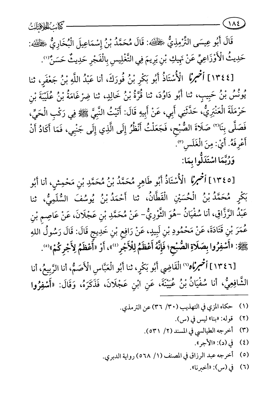 [1345] أخبرنا الْأُسْتَاذُ أَبُو طَاهِرٍ مُحَمَّدُ بْنُ مُحَمَّدِ بْنِ مَحْمِشٍ، أنا أَبُو بَكْرٍ مُحَمَّدُ بْنُ الْحُسَيْنِ الْقَطَّانُ، ثنا أَحْمَدُ بْنُ يُوسُفَ السُّلَمِيُّ، ثنا عَبْدُ الرَّزَّاقِ، أنا سُفْيَانُ - هُوَ الثَّوْرِيُّ - عَنْ مُحَمَّدِ بْنِ عَجْلَانَ، عَنْ عَاصِمِ بْنِ عُمَرَ بْنِ قَتَادَةَ، عَنْ مَحْمُودِ بْنِ لَبِيدٍ، عَنْ رَافِعِ بْنِ خَدِيجٍ قَالَ: قَالَ رَسُولُ اللَّهِ - صلى الله عليه وسلم -: "أَسْفِرُوا بِصَلَاةِ الصُّبْحِ؛ فَإِنَّهُ أَعْظَمُ لِلْأَجْرِ (¬4) "، أَوْ "أَعْظَمُ لِأَجْرِكُمْ" (¬5).