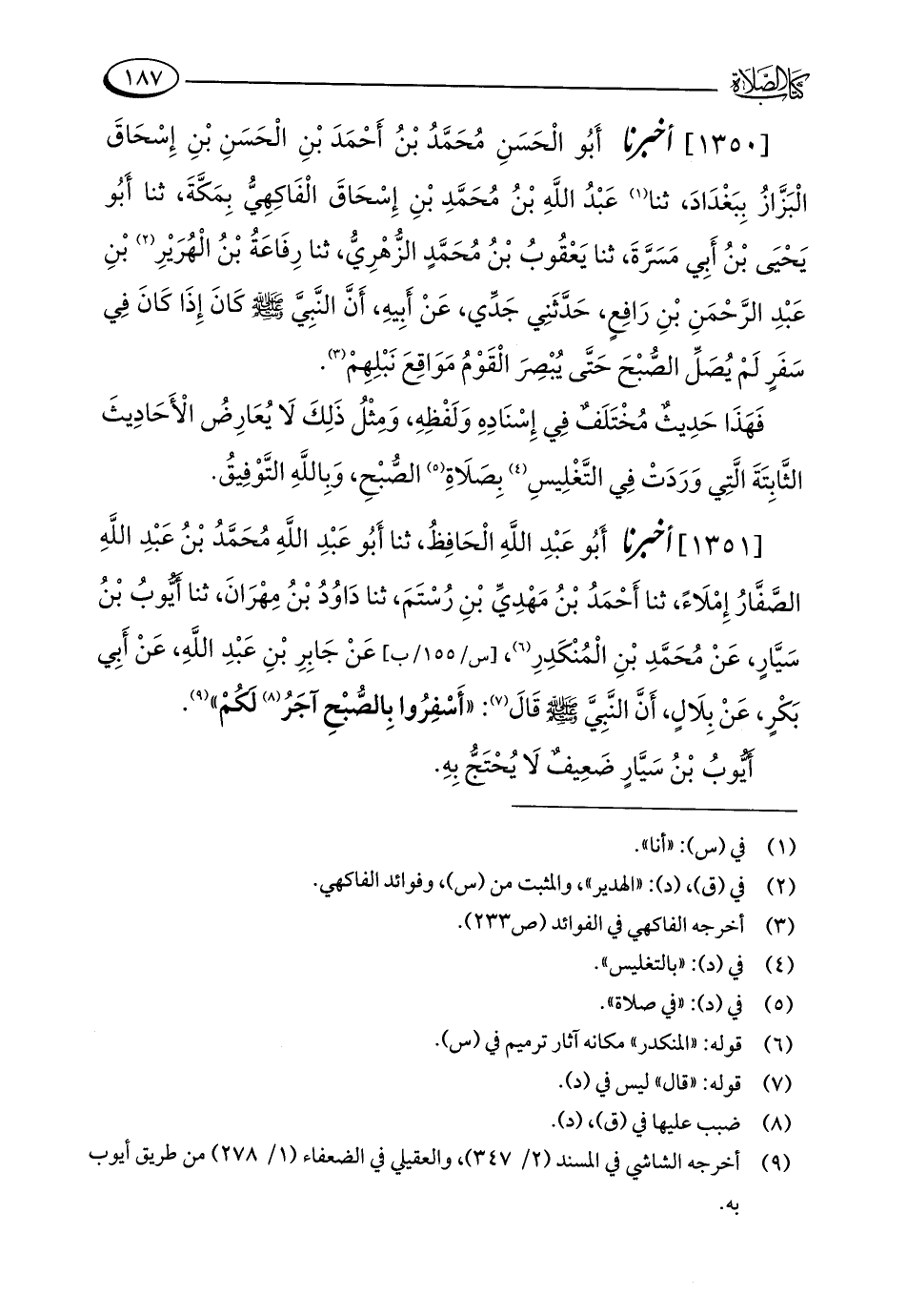 [1351] أخبرنا أَبُو عَبْدِ اللَّهِ الْحَافِظُ، ثنا أَبُو عَبْدِ اللَّهِ مُحَمَّدُ بْنُ عَبْدِ اللَّهِ الصَّفَّارُ إِمْلَاءً، ثنا أَحْمَدُ بْنُ مَهْدِيِّ بْنِ رُسْتَمَ، ثنا دَاوُدُ بْنُ مِهْرَانَ، ثنا أيُّوبُ بْنُ سَيَّارٍ، عَنْ مُحَمَّدِ بْنِ الْمُنْكَدِرِ (¬6)، عَنْ جَابِرِ بْنِ عَبْدِ اللَّهِ، عَنْ أَبِي بَكْرٍ، عَنْ بِلَالٍ، أَنَّ النَّبِيَّ - صلى الله عليه وسلم - قالَ (¬7): "أَسْفِرُوا بِالصُّبْحِ آجَرُ (¬8) لَكُمْ" (¬9).