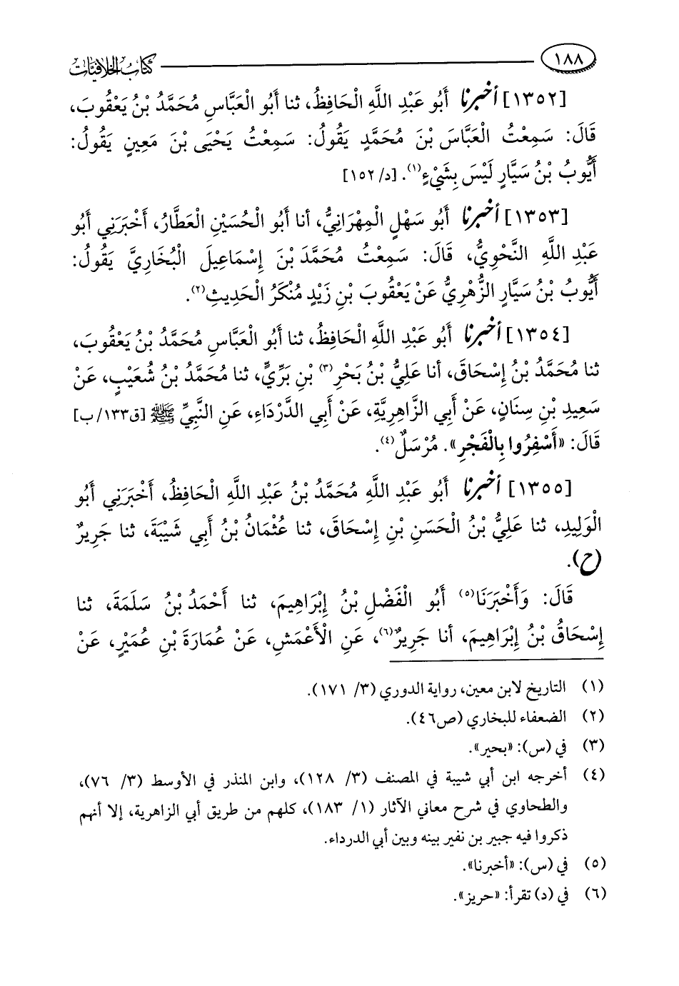 [1354] أخبرنا أَبُو عَبْدِ اللَّهِ الْحَافِظُ، ثنا أَبُو الْعَبَّاسِ مُحَمَّدُ بْنُ يَعْقُوبَ، ثنا مُحَمَّدُ بْنُ إِسْحَاقَ، أنا عَلِيُّ بْنُ بَحْرِ (¬3) بْنِ بَرِّيٍّ، ثنا مُحَمَّدُ بْنُ شُعَيْبٍ، عَنْ سَعِيدِ بْنِ سِنَانٍ، عَنْ أَبِي الزَّاهِرِيَّةِ، عَنْ أَبِي الدَّرْدَاءِ، عَنِ النَّبِيِّ - صلى الله عليه وسلم - قَالَ: "أَسْفِرُوا بِالْفَجْرِ". مُرْسَلٌ (¬4).