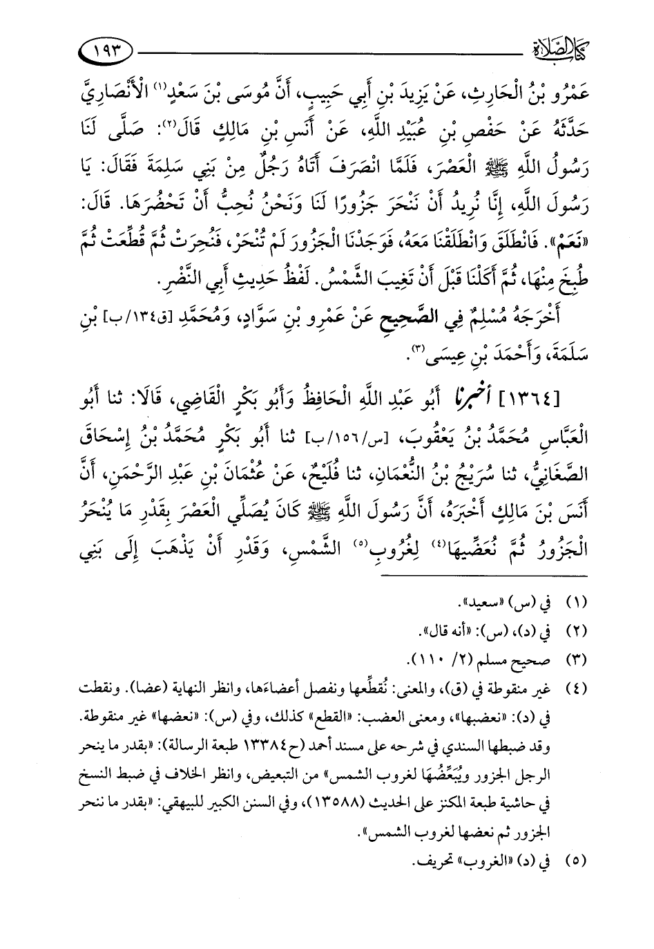 عَمْرُو بْنُ الْحَارِثِ، عَنْ يَزِيدَ بْنِ أَبِي حَبِيبٍ، أَنَّ مُوسَى بْنَ سَعْدٍ (¬1) الْأَنْصَارِيَّ حَدَّثَهُ عَنْ حَفْصِ بْنِ عُبَيْدِ اللَّهِ، عَنْ أَنَسِ بْنِ مَالِكٍ قَالَ (¬2): صَلَّى لَنَا رَسُولُ اللَّهِ - صلى الله عليه وسلم - الْعَصْرَ، فَلَمَّا انْصَرَفَ أَتَاهُ رَجُلٌ مِنْ بَنِي سَلِمَةَ فَقَالَ: يَا رَسُولَ اللَّهِ، إِنَّا نُرِيدُ أَنْ نَنْحَرَ جَزُورًا لَنَا وَنَحْنُ نُحِبُّ أَنْ تَحْضُرَهَا. قَالَ: "نَعَمْ". فَانْطَلَقَ وَانْطَلَقْنَا مَعَهُ، فَوَجَدْنَا الْجَزُورَ لَمْ تُنْحَرْ، فَنُحِرَتْ ثُمَّ قُطِّعَتْ ثُمَّ طُبِخَ مِنْهَا، ثُمَّ أَكَلْنَا قَبْلَ أَنْ تَغِيبَ الشَّمْسُ. لَفْظُ حَدِيثِ أَبِي النَّضْرِ.