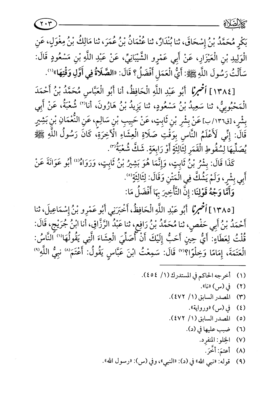 بَكْرٍ مُحَمَّدُ بْنُ إِسْحَاقَ، ثنا بُنْدَارٌ، ثنا عُثْمَانُ بْنُ عُمَرَ، ثنا مَالِكُ بْنُ مِغْوَلٍ، عَنِ الْوَلِيدِ بْنِ الْعَيْزَارِ، عَنْ أَبِي عَمْرٍو الشَّيْبَانِيِّ، عَنْ عَبْدِ اللَّهِ بْنِ مَسْعُودٍ قَالَ: سَأَلْتُ رَسُولَ اللَّهِ - صلى الله عليه وسلم -: أَيُّ الْعَمَلِ أَفْضَلُ؟ قَالَ: "الصَّلَاةُ فِي أَوَّلِ وَقْتِهَا" (¬1).