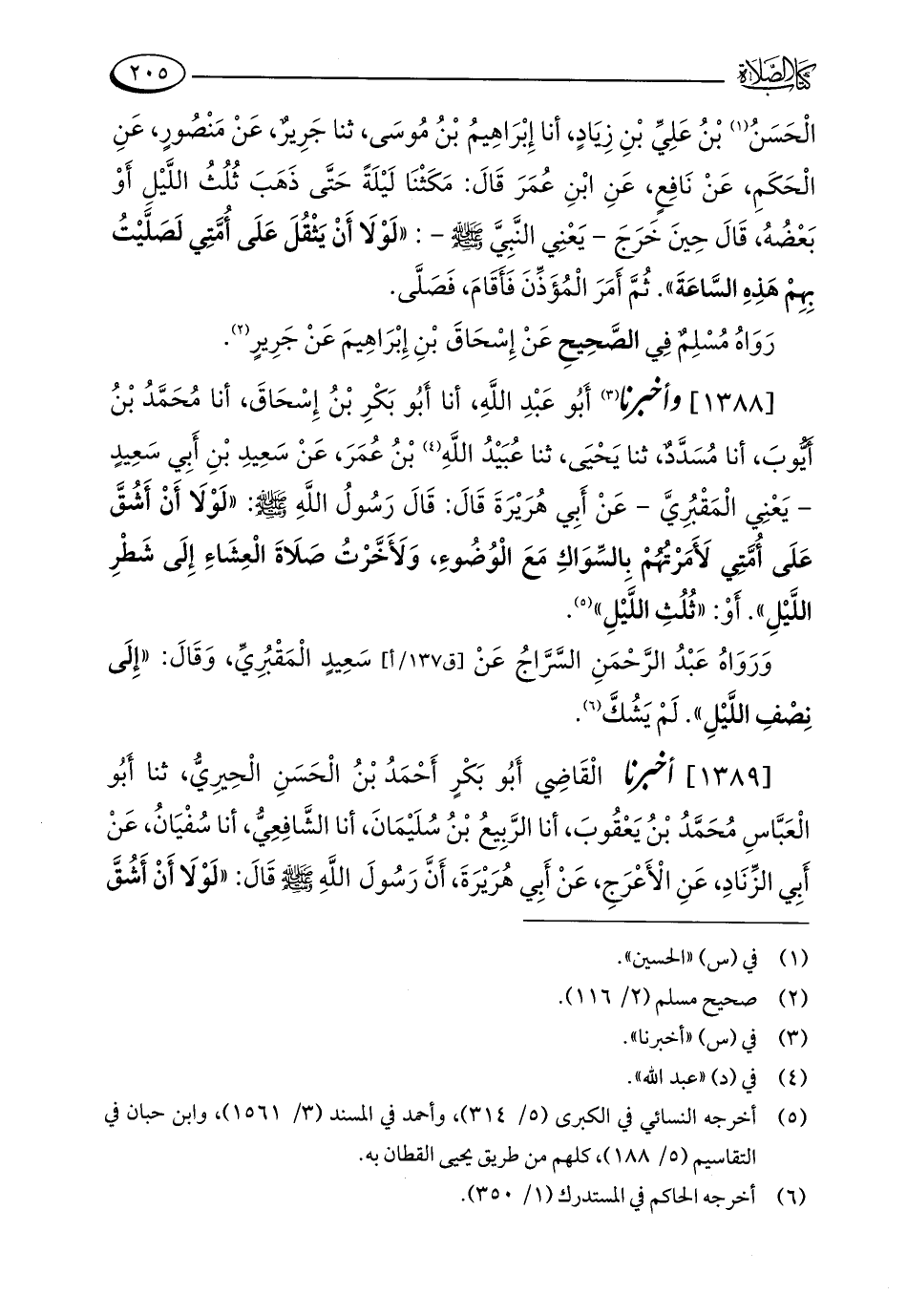 [1388] وأخبرنا (¬3) أَبُو عَبْدِ اللَّهِ، أنا أَبُو بَكْرِ بْنُ إِسْحَاقَ، أنا مُحَمَّدُ بْنُ أَيُّوبَ، أنا مُسَدَّدٌ، ثنا يَحْيَى، ثنا عُبَيْدُ اللَّهِ (¬4) بْنُ عُمَرَ، عن سَعِيدِ بْنِ أبِي سَعِيدٍ - يَعْنِي الْمَقْبُرِيَّ - عَنْ أَبِي هُرَيْرَةَ قَالَ: قَالَ رَسُولُ اللَّهِ - صلى الله عليه وسلم -: "لَوْلَا أَنْ أَشُقَّ عَلَى أُمَّتِي لَأَمَرْتُهُمْ بالسِّوَاكِ مَعَ الْوُضُوءِ، وَلَأَخَّرْتُ صَلَاةَ الْعِشَاءِ إِلَى شَطْرِ اللَّيْلِ". أَوْ: "ثُلُثِ اللَّيْلِ" (¬5).
