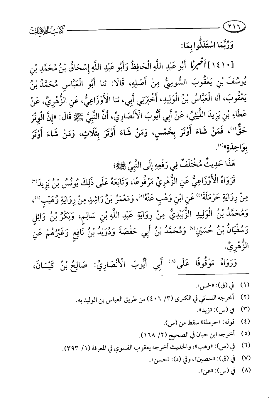 [1410] أخبرنا أَبُو عَبْدِ اللَّهِ الْحَافِظُ وَأَبُو عَبْدِ اللَّهِ إِسْحَاقُ بْنُ مُحَمَّدِ بْنِ يُوسُفَ بْنِ يَعْقُوبَ السُّوسِيُّ مِنْ أَصْلِهِ، قَالَا: ثنا أَبُو الْعَبَّاسِ مُحَمَّدُ بْنُ يَعْقُوبَ، أنا الْعَبَّاسُ بْنُ الْوَلِيدِ، أَخْبَرَنِي أَبِي، ثنا الْأَوْزَاعِيُّ، عَنِ الزُّهْرِيِّ، عَنْ عَطَاءِ بْنِ يَزِيدَ اللَّيْثِيِّ، عَنْ أَبِي أَيُّوبَ الْأَنْصَارِيِّ، أَنَّ النَّبِيَّ - صلى الله عليه وسلم - قَالَ: "إِنَّ الْوِتْرَ حَقٌّ (¬1)، فَمَنْ شَاءَ أَوْتَرَ بِخَمْسٍ، وَمَنْ شَاءَ أَوْتَرَ بِثَلَاثٍ، وَمَنْ شَاءَ أَوْتَرَ بِوَاحِدَةٍ" (¬2).