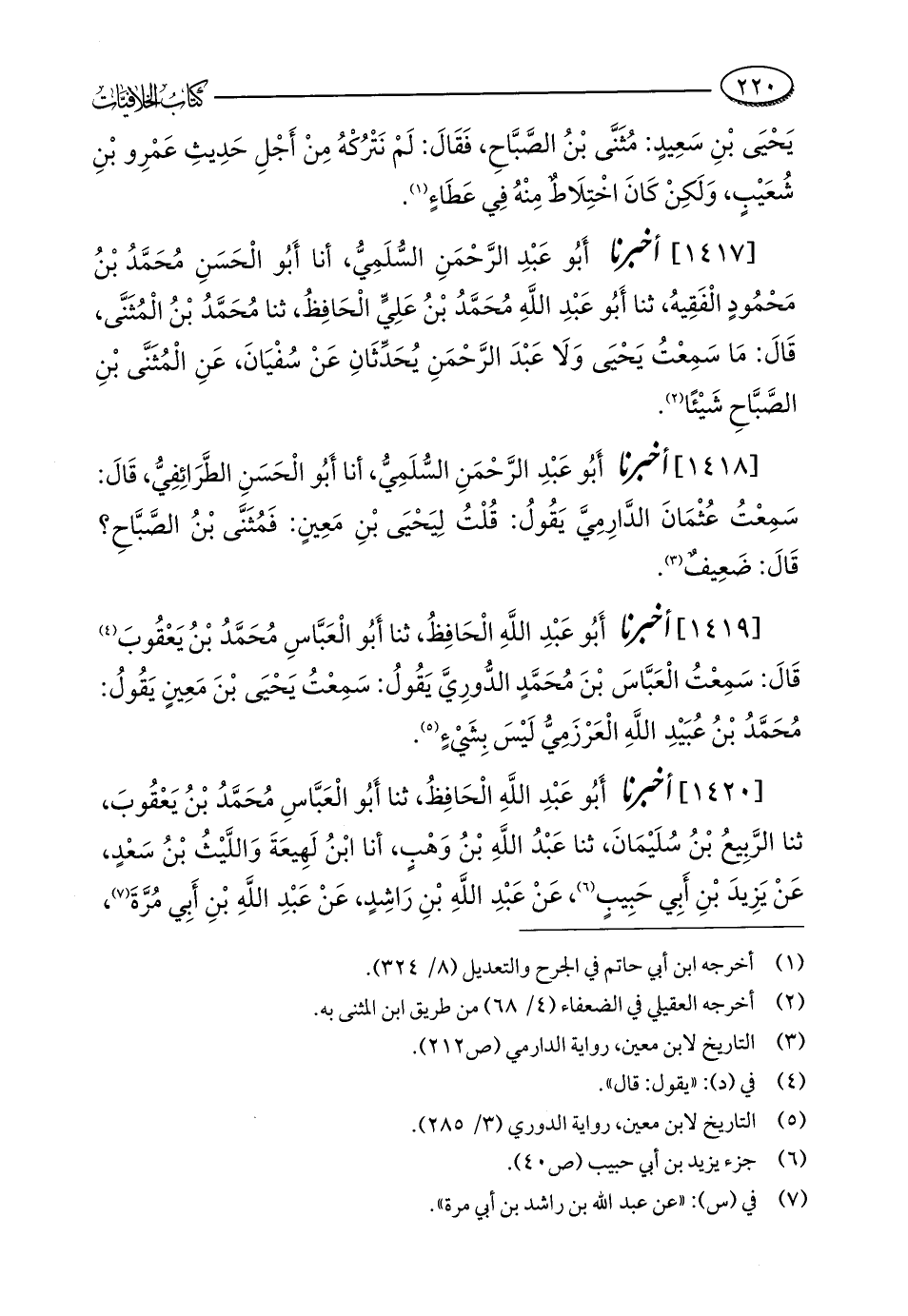 [1418] أخبرنا أَبُو عَبْدِ الرَّحْمَنِ السُّلَمِيُّ، أنا أَبُو الْحَسَنِ الطَّرَائِفِيُّ، قَالَ: سَمِعْتُ عُثْمَانَ الدَّارِمِيَّ يَقُولُ: قُلْتُ لِيَحْيَى بْنِ مَعِينٍ: فَمُثَنَّى بْنُ الصَّبَّاحِ؟ قَالَ: ضَعِيفٌ (¬3).