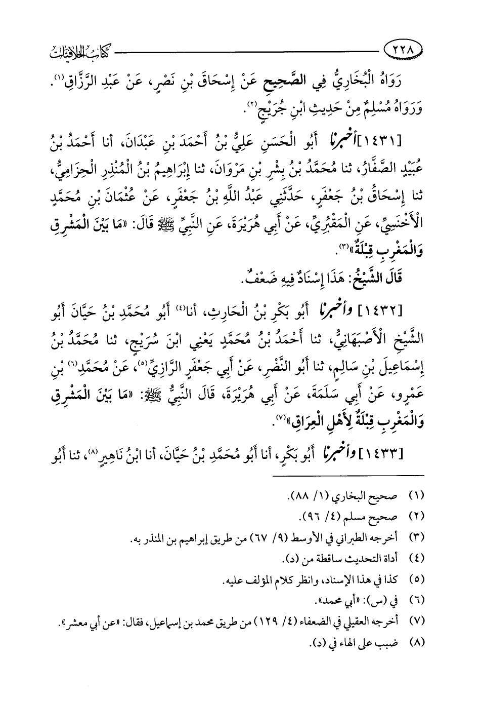 [1432] وأخبرنا أَبُو بَكْرِ بْنُ الْحَارِثِ، أنا (¬4) أَبُو مُحَمَّدِ بْنُ حَيَّانَ أَبُو الشَّيْخِ الْأَصْبَهَانِيُّ، ثنا أَحْمَدُ بْنُ مُحَمَّدٍ يَعْنِي ابْنَ سُرَيْجٍ، ثنا مُحَمَّدُ بْنُ إِسْمَاعِيلَ بْنِ سَالِمٍ، ثنا أَبُو النَّضْرِ، عَنْ أَبِي جَعْفَرٍ الرَّازِيِّ (¬5)، عَنْ مُحَمَّدِ (¬6) بْنِ عَمْرٍو، عَنْ أَبِي سَلَمَةَ، عَنْ أَبِي هُرَيْرَةَ، قَالَ النَّبِيُّ - صلى الله عليه وسلم -: "مَا بَيْنَ الْمَشْرِقِ وَالْمَغْرِبِ قِبْلَةٌ لِأَهْلِ الْعِرَاقِ" (¬7).