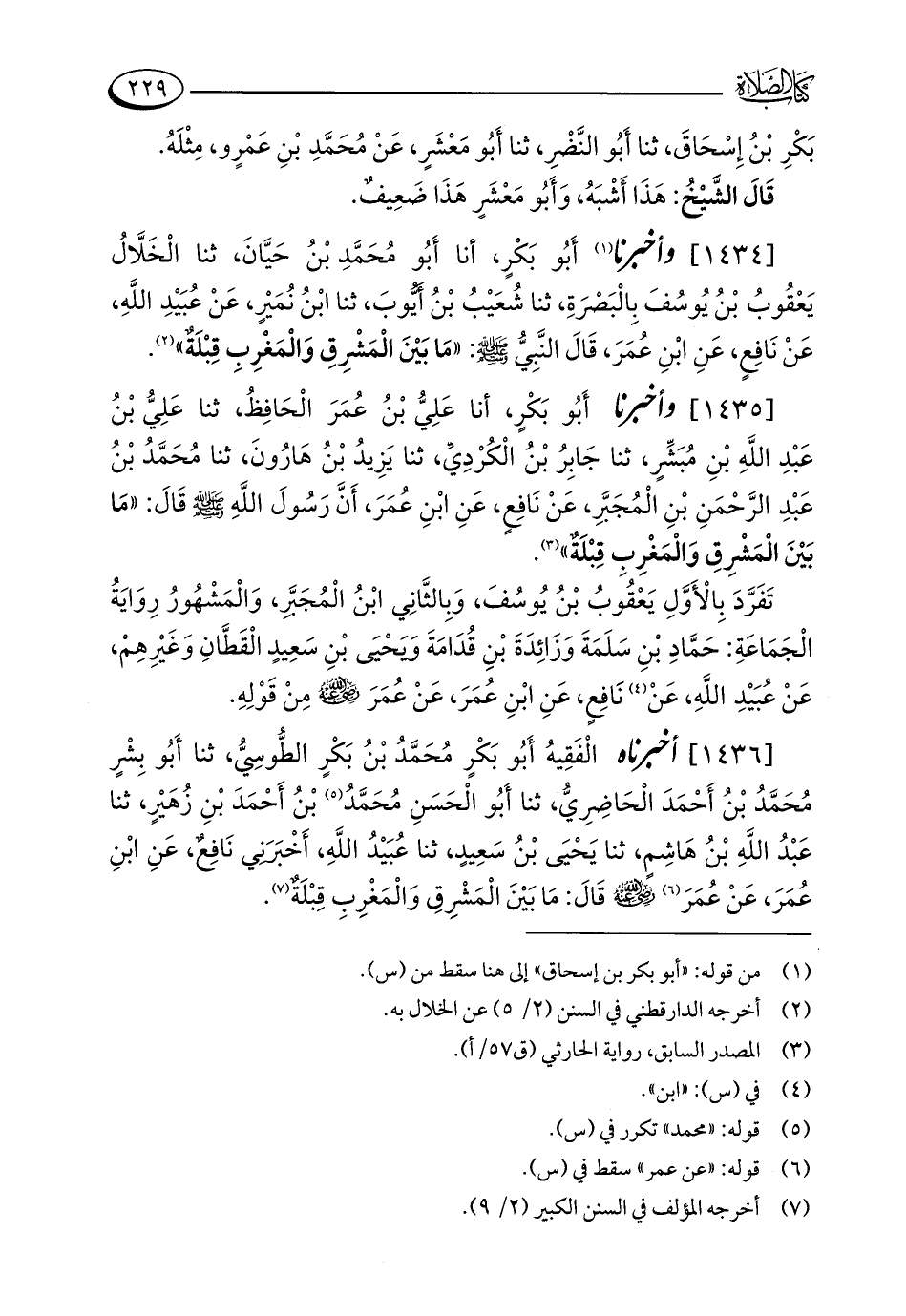 [1436] أخبرنا الْفَقِيهُ أَبُو بَكْرٍ مُحَمَّدُ بْنُ بَكْرٍ الطُّوسِيُّ، ثنا أَبُو بِشْرٍ مُحَمَّدُ بْنُ أَحْمَدَ الْحَاضِرِيُّ، ثنا أَبُو الْحَسَنِ مُحَمَّدُ (¬5) بْنُ أَحْمَدَ بْنِ زُهَيْرٍ، ثنا عَبْدُ اللَّهِ بْنُ هَاشِمٍ، ثنا يَحْيَى بْنُ سَعِيدٍ، ثنا عُبَيْدُ اللَّهِ، أَخْبَرَنِي نَافِعٌ، عَنِ ابْنِ عُمَرَ، عَنْ عُمَرَ (¬6) - رضي الله عنه - قَالَ: مَا بَيْنَ الْمَشْرِقِ وَالْمَغْرِبِ قِبْلَةٌ (¬7).