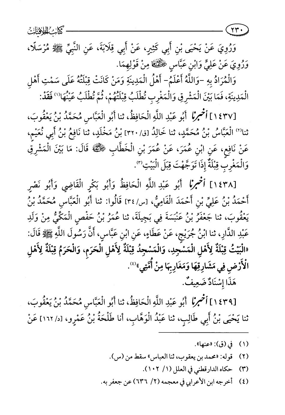 [1438] أخبرنا أَبُو عَبْدِ اللَّهِ الْحَافِظُ وَأَبُو بَكْرٍ الْقَاضِي وَأَبُو نَصْرٍ أَحْمَدُ بْنُ عَلِيِّ بْنِ أَحْمَدَ الْفَامِيُّ، قَالُوا: ثنا أَبُو الْعَبَّاسِ مُحَمَّدُ بْنُ يَعْقُوبَ، ثنا جَعْفَرُ بْنُ عَنْبَسَةَ فِي بَجِيلَةَ، ثنا عُمَرُ بْنُ حَفْصٍ الْمَكِّيُّ مِنْ وَلَدِ عَبْدِ الدَّارِ، ثنا ابْنُ جُرَيْجٍ، عَنْ عَطَاءٍ، عَنِ ابْنِ عَبَّاسٍ، أَنَّ رَسُولَ اللَّهِ - صلى الله عليه وسلم - قَالَ: "الْبَيْتُ قِبْلَةٌ لِأَهْلِ الْمَسْجِدِ، وَالْمَسْجِدُ قِبْلَةٌ لِأَهْلِ الْحَرَمِ، وَالْحَرَمُ قِبْلَةٌ لِأَهْلِ الْأَرْضِ فِي مَشَارِقِهَا وَمَغَارِبِهَا مِنْ أُمَّتِي" (¬4).