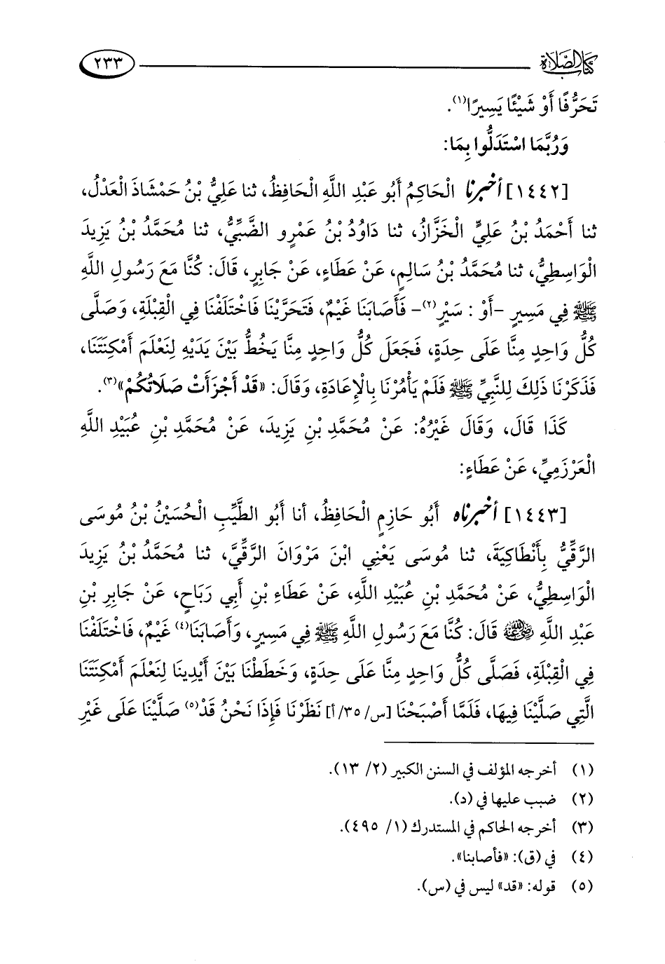 [1443] أخبرناه أَبُو حَازِمٍ الْحَافِظُ، أنا أَبُو الطَّيِّبِ الْحُسَيْنُ بْنُ مُوسَى الرَّقِّيُّ بِأَنْطَاكِيَةَ، ثنا مُوسَى يَعْنِي ابْنَ مَرْوَانَ الرَّقِّيَّ، ثنا مُحَمَّدُ بْنُ يَزِيدَ الْوَاسِطِيُّ، عَنْ مُحَمَّدِ بْنِ عُبَيْدِ اللَّهِ، عَنْ عَطَاءِ بْنِ أَبِي رَبَاحٍ، عَنْ جَابِرِ بْنِ عَبْدِ اللَّهِ - رضي الله عنه - قَالَ: كُنَّا مَعَ رَسُولِ اللَّهِ - صلى الله عليه وسلم - فِي مَسِيرٍ، وَأَصَابَنَا (¬4) غَيْمٌ، فَاخْتَلَفْنَا فِي الْقِبْلَةِ، فَصَلَّى كُلُّ وَاحِدٍ مِنَّا عَلَى حِدَةٍ، وَخَطَطْنَا بَيْنَ أَيْدِينَا لِنَعْلَمَ أَمْكِنَتَنَا الَّتِي صَلَّيْنَا فِيهَا، فَلَمَّا أَصْبَحْنَا نَظَرْنَا فَإِذَا نَحْنُ قَدْ (¬5) صَلَّيْنَا عَلَى غَيْرِ