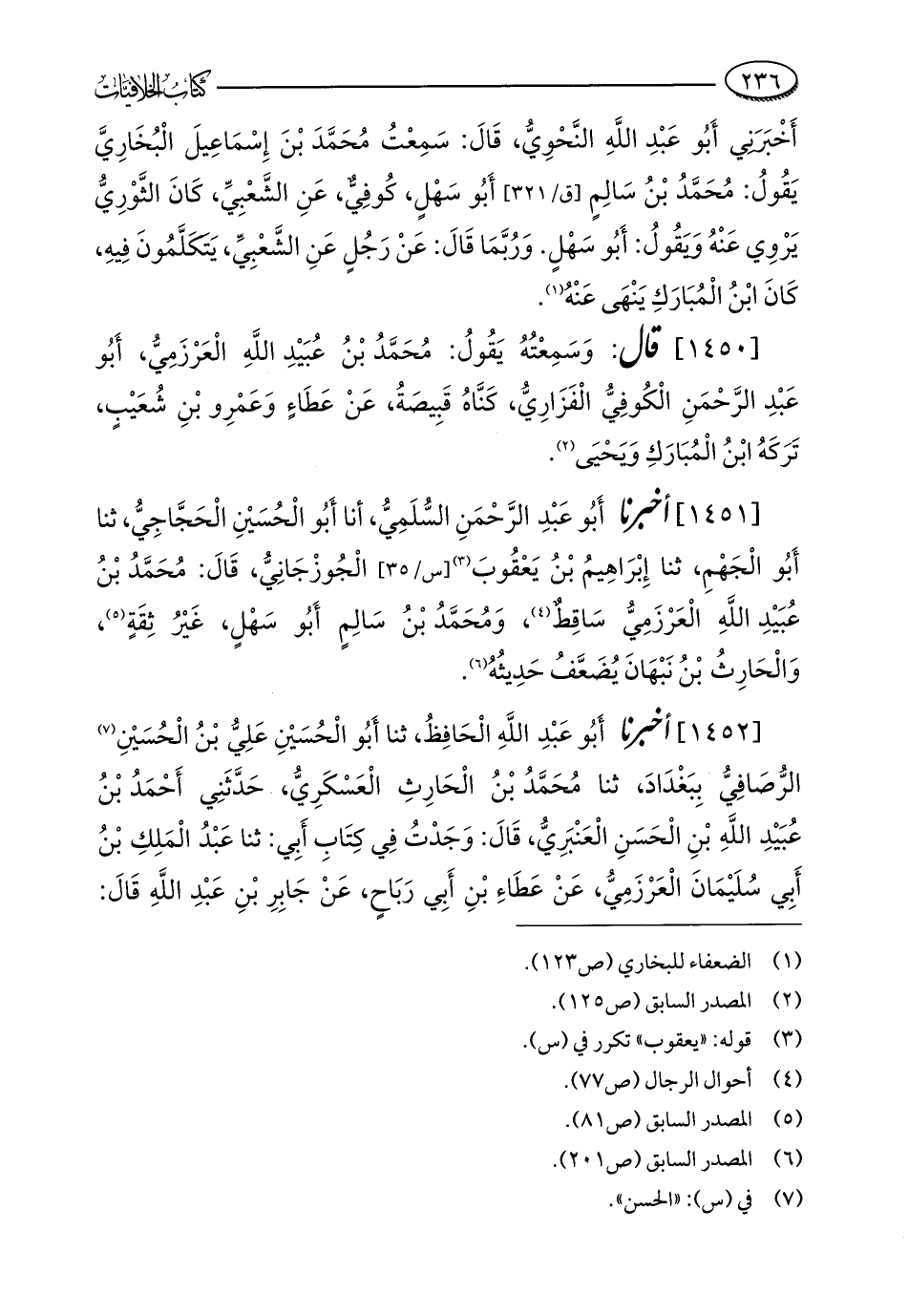 [1451] أخبرنا أَبُو عَبْدِ الرَّحْمَنِ السُّلَمِيُّ، أنا أَبُو الْحُسَيْنِ الْحَجَّاجِيُّ، ثنا أَبُو الْجَهْمِ، ثنا إِبْرَاهِيمُ بْنُ يَعْقُوبَ (¬3) الْجُوزْجَانِيُّ، قَالَ: مُحَمَّدُ بْنُ عُبَيْدِ اللَّهِ الْعَرْزَمِيُّ سَاقِطٌ (¬4)، وَمُحَمَّدُ بْنُ سَالِمٍ أَبُو سَهْلٍ، غَيْرُ ثِقَةٍ (¬5)، وَالْحَارِثُ بْنُ نَبْهَانَ يُضَعَّفُ حَدِيثُهُ (¬6).