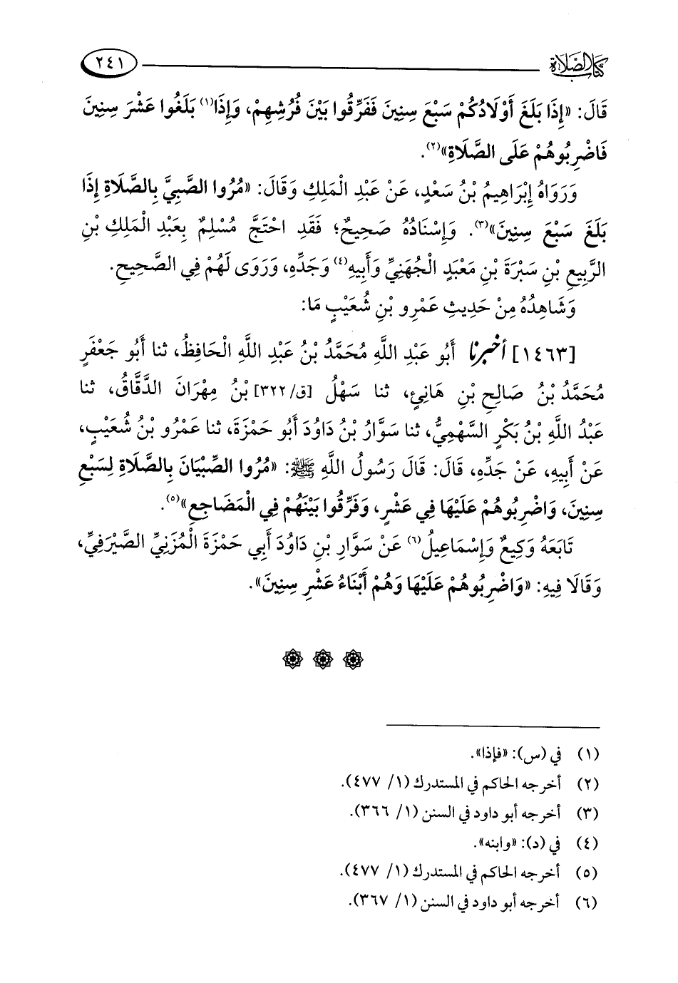 [1463] أخبرنا أَبُو عَبْدِ اللَّهِ مُحَمَّدُ بْنُ عَبْدِ اللَّهِ الْحَافِظُ، ثنا أَبُو جَعْفَرٍ مُحَمَّدُ بْنُ صَالِحِ بْنِ هَانِئٍ، ثنا سَهْلُ بْنُ مِهْرَانَ الدَّقَّاقُ، ثنا عَبْدُ اللَّهِ بْنُ بَكْرٍ السَّهْمِيُّ، ثنا سَوَّارُ بْنُ دَاوُدَ أَبُو حَمْزَةَ، ثنا عَمْرُو بْنُ شُعَيْبٍ، عَنْ أَبِيهِ، عَنْ جَدِّهِ، قَالَ: قَالَ رَسُولُ اللَّهِ - صلى الله عليه وسلم -: "مُرُوا الصِّبْيَانَ بِالصَّلَاةِ لِسَبْعِ سِنِينَ، وَاضْرِبُوهُمْ عَلَيْهَا فِي عَشْرٍ، وَفَرِّقُوا بَيْنَهُمْ فِي الْمَضَاجِعِ" (¬5).