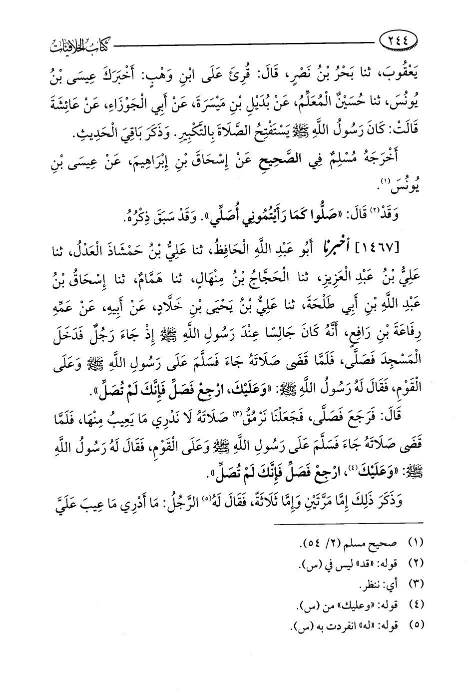 [1467] أخبرنا أَبُو عَبْدِ اللَّهِ الْحَافِظُ، ثنا عَلِيُّ بْنُ حَمْشَاذَ الْعَدْلُ، ثنا عَلِيُّ بْنُ عَبْدِ الْعَزِيزِ، ثنا الْحَجَّاجُ بْنُ مِنْهَالٍ، ثنا هَمَّامٌ، ثنا إِسْحَاقُ بْنُ عَبْدِ اللَّهِ بْنِ أَبِي طَلْحَةَ، ثنا عَلِيُّ بْنُ يَحْيَى بْنِ خَلَّادٍ، عَنْ أَبِيهِ، عَنْ عَمِّهِ رِفَاعَةَ بْنِ رَافِعٍ، أَنَّهُ كَانَ جَالِسًا عِنْدَ رَسُولِ اللَّهِ - صلى الله عليه وسلم - إذْ جَاءَ رَجُلٌ فَدَخَلَ الْمَسْجِدَ فَصَلَّى، فَلَمَّا قَضَى صَلَاتَهُ جَاءَ فَسَلَّمَ عَلَى رَسُولِ اللَّهِ - صلى الله عليه وسلم - وعَلَى الْقَوْمِ، فَقَالَ لَهُ رَسُولُ اللَّهِ - صلى الله عليه وسلم -: "وَعَلَيْكَ, ارْجِعْ فَصَلِّ فَإِنَّكَ لَمْ تُصَلِّ".