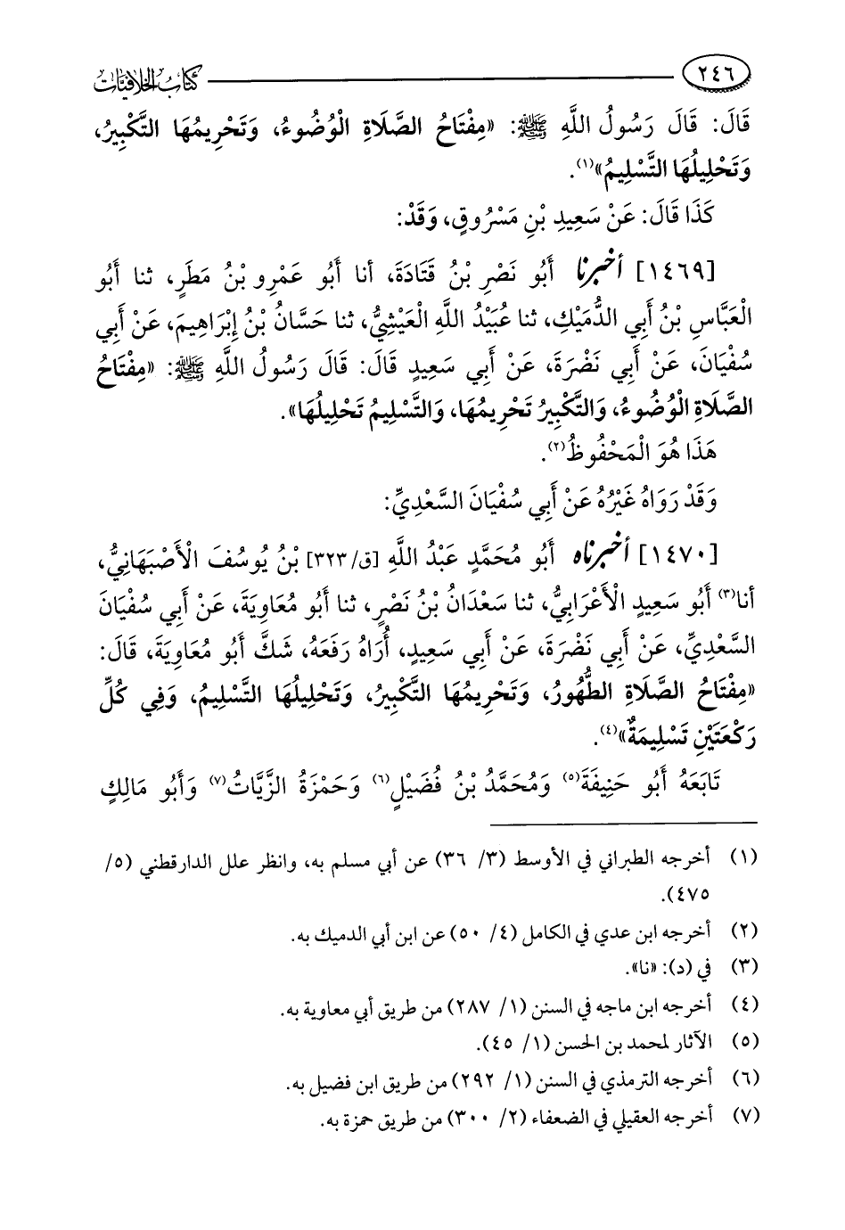 [1470] أخبرناه أَبُو مُحَمَّدٍ عَبْدُ اللَّهِ بْنُ يُوسُفَ الْأَصْبَهَانِيُّ، أنا (¬3) أَبُو سَعِيدٍ الْأَعْرَابِيُّ، ثنا سَعْدَانُ بْنُ نَصْرٍ، ثنا أَبُو مُعَاوِيَةَ، عَنْ أَبِي سُفْيَانَ السَّعْدِيِّ، عَنْ أَبِي نَضْرَةَ، عَنْ أَبِي سَعِيدٍ، أُرَاهُ رَفَعَهُ، شَكَّ أَبُو مُعَاوِيَةَ، قَالَ: "مِفْتَاحُ الصَّلَاةِ الطُّهُورُ، وَتَحْرِيمُهَا التَّكْبِيرُ، وَتَحْلِيلُهَا التَّسْلِيمُ، وَفِي كُلِّ رَكْعَتَيْنِ تَسْلِيمَةٌ" (¬4).