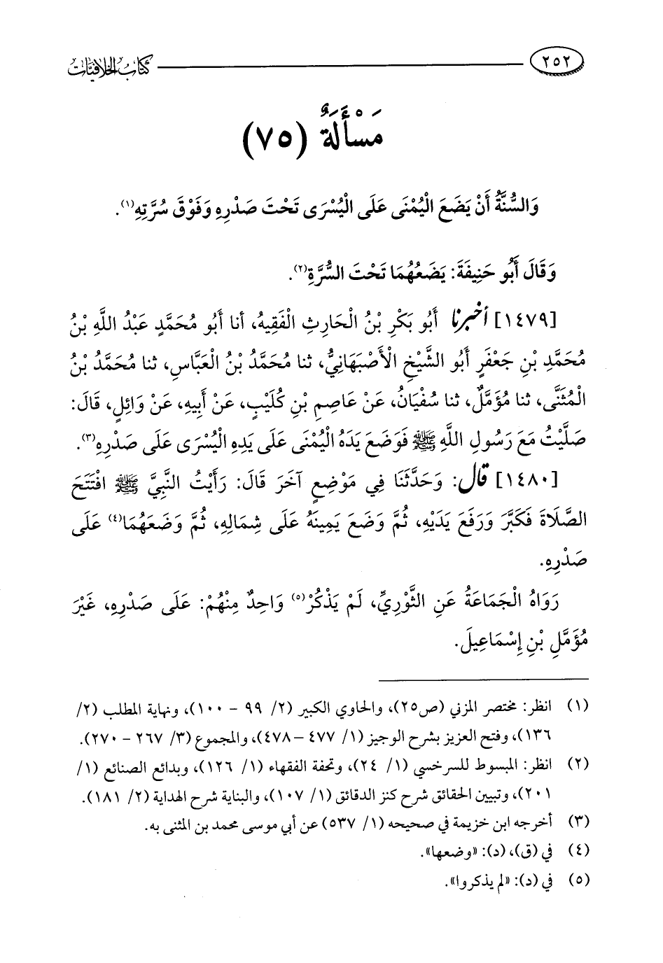 [1480] قال: وَحَدَّثَنَا فِي مَوْضِعٍ آخَرَ قَالَ: رَأَيْتُ النَّبِيَّ - صلى الله عليه وسلم - افْتَتَحَ الصَّلَاةَ فَكَبَّرَ وَرَفَعَ يَدَيْهِ، ثُمَّ وَضَعَ يَمِينَهُ عَلَى شِمَالِهِ، ثُمَّ وَضَعَهُمَا (¬4) عَلَى صَدْرِهِ.